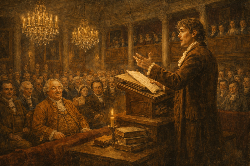 Please generate a 16:9 image in warm Enlightenment-era oil painting style depicting panel 4 of 14. Make the characters and style consistent with the prior panels. The scene shows Adam Smith, now in his late 20s, delivering a public lecture in an elegant Edinburgh assembly room, circa 1748. He stands at a lectern before a packed audience of well-dressed Scottish gentlemen and a few women in the gallery. Smith is animated despite his shyness — one hand gestures while the other grips his notes. In the front row, the philosopher David Hume — a plump, jovial man with bright eyes — watches with a delighted smile. The room is lit by dozens of candles in crystal chandeliers. The walls are adorned with classical columns and portraits. The color palette is warm candlelight golds against deep burgundy and forest green fabrics. The emotional tone is intellectual excitement and the birth of a friendship. Generate the image now.Back in Scotland, Smith began giving public lectures in Edinburgh on rhetoric and literature. These lectures were a sensation — crowds packed the hall to hear this eccentric young thinker connect ideas about language, history, and human nature in ways no one had before. It was here that Smith met David Hume, already Scotland's most famous (and most controversial) philosopher. The two became lifelong friends — an odd pair, since Hume was sociable and witty while Smith was reserved and absent-minded. But they shared something deeper: a conviction that understanding human behavior required observation, not just theology.
