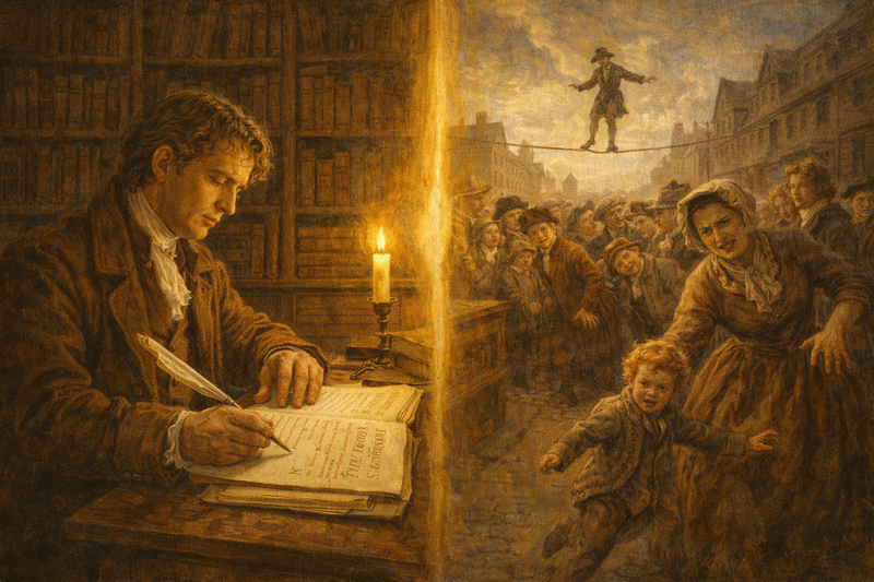 Please generate a 16:9 image in warm Enlightenment-era oil painting style depicting panel 5 of 14. Make the characters and style consistent with the prior panels. The scene is a split composition. On the left side, Adam Smith sits in a book-lined study in Glasgow, circa 1759, writing by candlelight — the manuscript pages before him are titled "The Theory of Moral Sentiments." He is in his mid-30s, wearing a simple brown coat and white cravat. On the right side, a visual metaphor: a crowded Glasgow street scene where people unconsciously mirror each other's emotions — a mother wincing as her child stumbles, a crowd of spectators at a rope-walker all leaning to one side in sympathy. Connecting both halves is a warm golden light suggesting the insight that links them. The color palette is warm browns, creams, and golden highlights. The emotional tone is revelatory — the moment when private reflection meets universal truth. Generate the image now.In 1759, Smith published his first masterwork: The Theory of Moral Sentiments. Its central idea was radical for its time — and still surprises people today. Smith argued that human society is held together not by reason or religion, but by sympathy: our ability to imagine ourselves in another person's situation and feel what they feel. He noticed that when we watch a tightrope walker, we instinctively lean and sway. When a friend suffers, we suffer too. This "fellow-feeling," Smith argued, is the glue of civilization. It was a bestseller, and it made him famous across Europe. But Smith wasn't done — he sensed a deeper puzzle waiting to be solved.