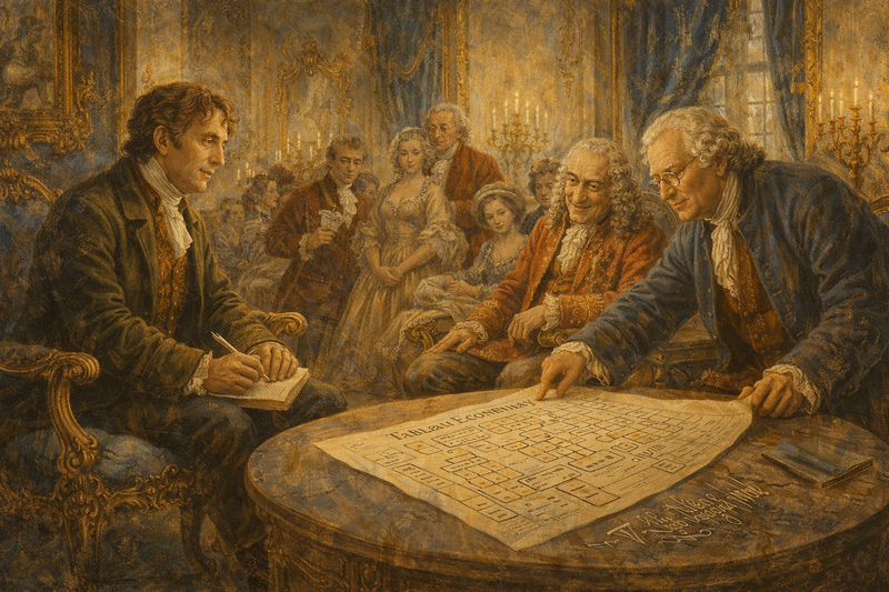 Please generate a 16:9 image in warm Enlightenment-era oil painting style depicting panel 7 of 14. Make the characters and style consistent with the prior panels. The scene shows Adam Smith in a Parisian salon, circa 1766. He sits in an ornate chair in a lavishly decorated room — gilt mirrors, silk curtains, Rococo flourishes — surrounded by French intellectuals. Across from him sits Voltaire, elderly and sharp-eyed, leaning forward with interest. Nearby, the Physiocrat François Quesnay — an older man with spectacles and a physician's air — shows Smith a large chart on the table: his "Tableau Économique," a flow diagram of the economy. Other philosophers and well-dressed women look on. Smith appears slightly uncomfortable with the opulence but intellectually engaged. The color palette is rich French blues, golds, and ivory. The emotional tone is cross-pollination of ideas across cultures. Generate the image now.In 1764, Smith left his university post to serve as tutor to the young Duke of Buccleuch on a "Grand Tour" of Europe. In Paris, he encountered the most brilliant minds of the French Enlightenment. He debated Voltaire. He studied with the Physiocrats, particularly François Quesnay, the physician-turned-economist who had created the first model of an economy as a circular flow system. Smith absorbed their insight that economies are systems — interconnected networks where changes in one part ripple through the whole. But he also saw where they were wrong, and the ideas for a far more ambitious book began to crystallize in his mind.