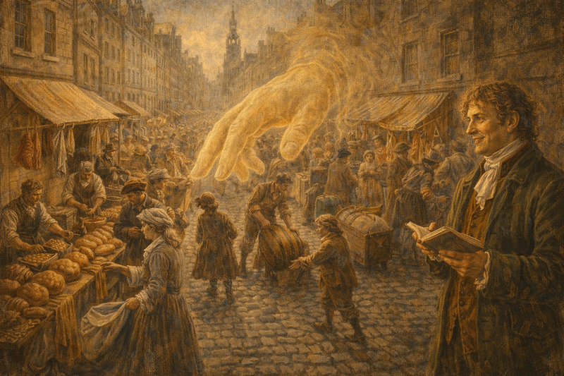 Please generate a 16:9 image in warm Enlightenment-era oil painting style depicting panel 8 of 14. Make the characters and style consistent with the prior panels. The scene shows a bustling 18th-century Scottish market town — Edinburgh's High Street, circa 1770. The view is from slightly above, looking down the cobblestone street crowded with merchants, shoppers, and craftspeople. A baker displays bread, a butcher hangs cuts of meat, a brewer rolls a barrel, a weaver shows cloth — each pursuing their own trade. Overlaid on the scene, like a ghostly presence, is a giant translucent hand made of flowing golden light, gently guiding the flow of goods and people without anyone noticing it. Adam Smith stands to one side of the scene, in his green coat, watching the market with a knowing smile, his notebook in hand. The color palette is the warm bustle of everyday commerce — earth tones, market colors, with the ethereal gold of the invisible hand. The emotional tone is wonder at the hidden order within apparent chaos. Generate the image now.Back in Scotland, Smith spent the next decade writing his masterwork in quiet Kirkcaldy, living with his mother. The central insight he labored to explain was what he called "the invisible hand": the idea that when individuals pursue their own self-interest through trade and specialization, they unintentionally promote the good of society as a whole. The baker doesn't bake bread out of kindness — he bakes it to earn a living. But the result is that everyone gets bread. Smith was not naive about this; he warned extensively about monopolies, collusion, and the exploitation of workers. The invisible hand, he understood, only works when markets are fair and open.