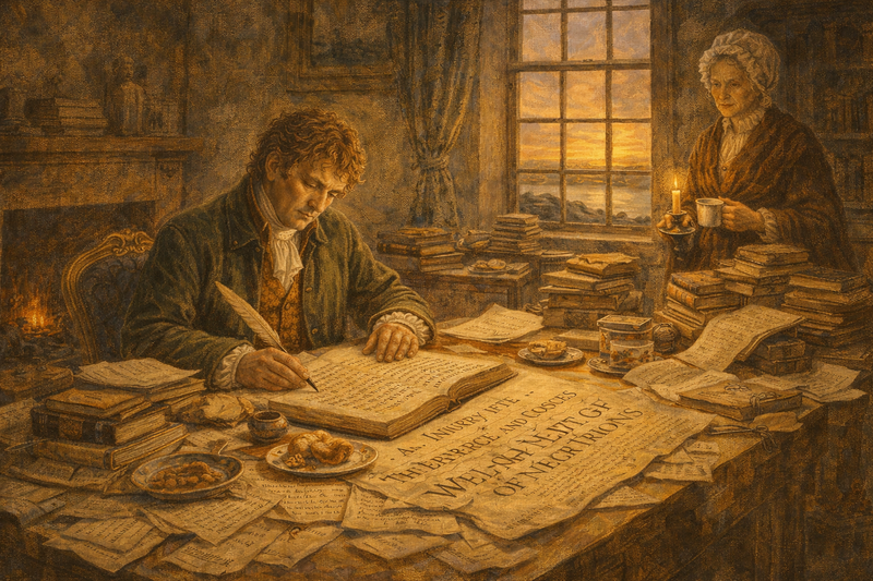 Please generate a 16:9 image in warm Enlightenment-era oil painting style depicting panel 9 of 14. Make the characters and style consistent with the prior panels. The scene shows Adam Smith's study in Kirkcaldy, 1776. The room is cluttered chaos — towers of books, scattered papers, half-eaten meals on plates pushed aside, a cold fireplace. Smith sits at a large desk, quill in hand, looking exhausted but triumphant. Before him lies a massive completed manuscript: "An Inquiry into the Nature and Causes of the Wealth of Nations." His mother, Margaret Douglas, now elderly, stands in the doorway holding a candle and a cup of tea, looking at her son with quiet pride. Through the window, a new day is dawning over the Firth of Forth. The color palette is the warm mess of creative labor — papers and books in cream and brown, ink stains, with the dawn light bringing rose and gold through the window. The emotional tone is exhausted triumph and maternal love. Generate the image now.On March 9, 1776 — the same year as the American Declaration of Independence — An Inquiry into the Nature and Causes of the Wealth of Nations was published. It was enormous: five books, over 900 pages, covering everything from the price of silver to the economics of education. Smith argued that a nation's wealth comes not from gold or conquest but from the productive labor of its people. He attacked monopolies, trade restrictions, and the colonial exploitation of foreign lands. He championed free trade not as a dogma but as a tool for mutual benefit. The book was an immediate success, but Smith, characteristically, worried that no one would read it.