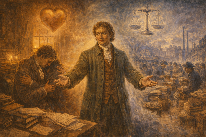 Please generate a 16:9 image in warm Enlightenment-era oil painting style depicting panel 10 of 14. Make the characters and style consistent with the prior panels. The scene is a visual essay showing the tension at the heart of Smith's thought. On the left side of the panel, a warm, intimate scene: Smith comforting a grieving friend, representing The Theory of Moral Sentiments and the power of sympathy. On the right side, a dynamic market scene representing The Wealth of Nations: traders exchanging goods, a factory producing efficiently. In the center, Adam Smith stands as a bridge between both worlds, one hand reaching toward empathy, the other toward commerce. Above him, like two sides of a coin, float ghostly images of a heart and a scale. The background transitions from warm domestic interior on the left to bustling commercial exterior on the right. The color palette transitions from warm reds and golds (sympathy) to cool blues and silvers (commerce). The emotional tone is philosophical depth — showing that Smith saw these not as contradictions but as two aspects of the same human nature. Generate the image now.Many people today think Adam Smith was simply the champion of selfishness and free markets. This misses the deepest insight of his life's work. Smith wrote two great books, and he considered The Theory of Moral Sentiments the more important one. His vision of economics was built on a foundation of empathy. Yes, self-interest drives commerce — but sympathy, fairness, and moral judgment hold society together. Smith spent his entire career revising both books, trying to reconcile these two forces. He understood what many economists after him forgot: markets work only when embedded in a society of people who care about each other.