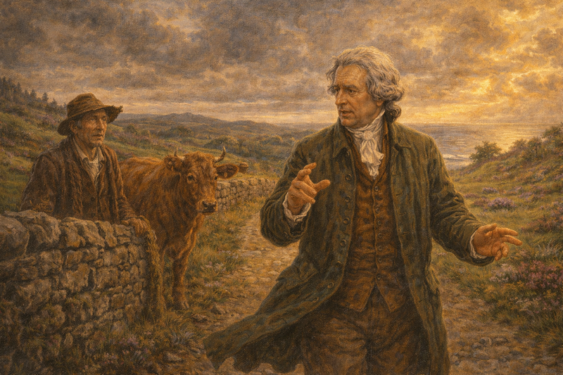 Please generate a 16:9 image in warm Enlightenment-era oil painting style depicting panel 11 of 14. Make the characters and style consistent with the prior panels. The scene shows an older Adam Smith, in his 60s, walking alone on a path through the Scottish countryside near Kirkcaldy, circa 1785. He is deep in thought, gesturing and talking to himself, completely unaware of his surroundings. His wig is slightly askew, his coat unbuttoned. He is about to walk past a startled farmer and his cow without noticing them. The landscape is beautiful — rolling green hills, heather in purple bloom, a stone wall, the sea in the distance. The sky is dramatic with both clouds and golden light breaking through. The color palette is the full spectrum of Scottish landscape — deep greens, purple heather, gray stone, golden light. The emotional tone is affectionate humor and the charm of genius — showing that the man who explained the world to itself could barely navigate a country path. Generate the image now.Smith's eccentricities became legendary. He once walked fifteen miles in his nightgown, so lost in thought that he didn't notice until church bells snapped him out of his reverie. At dinner parties, he would fall silent for long stretches, then suddenly burst out with a complete theory, startling the other guests. He put bread and butter into a teapot, poured water on them, and declared it the worst tea he'd ever tasted. His friends loved him for it. Beneath the absent-mindedness was a mind that never stopped watching, questioning, and connecting — finding patterns in human behavior that others walked right past.