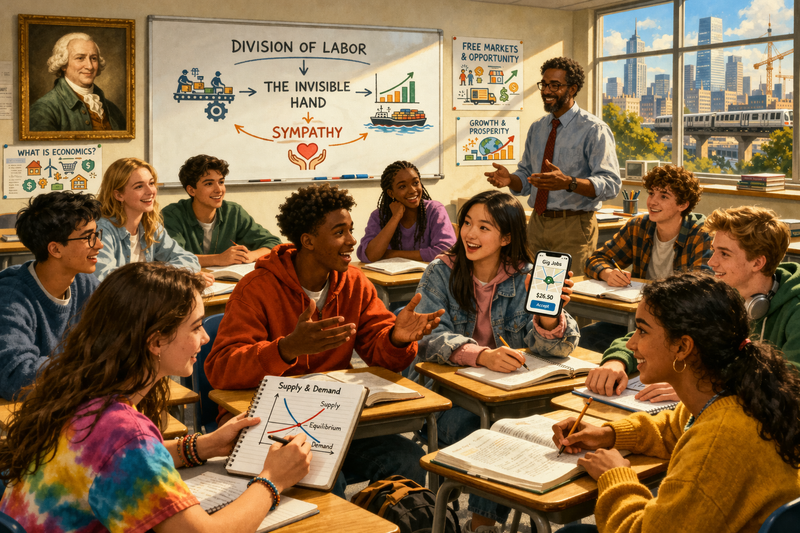 Please generate a 16:9 image in warm Enlightenment-era oil painting style depicting panel 13 of 14. Make the characters and style consistent with the prior panels, however this one has much more bright colors showing the transition to a positive energy modern era. The scene shows a modern high school economics classroom. Diverse students — different races, genders, and backgrounds — sit at desks engaged in a lively discussion. On the whiteboard behind them are key Smith concepts: "Division of Labor," "The Invisible Hand," "Sympathy," with arrows connecting them. One student is sketching a supply-and-demand curve. Another holds up a phone showing a gig economy app, connecting Smith's ideas to modern work. A teacher stands to the side, facilitating rather than lecturing. On the wall, a portrait of Adam Smith watches the scene with a slight smile. Through the classroom windows, a modern city is visible. The color palette blends warm classroom tones with bright, diverse clothing colors with many bright colors. The emotional tone is connection across time — Smith's questions are still alive in this room. Generate the image now.Smith left behind a question that economics is still trying to answer: How do we build societies where self-interest and sympathy work together instead of against each other? Where markets create prosperity without crushing the people they're supposed to serve? Where specialization makes us productive without making us narrow? Today's biggest economic challenges — inequality, climate change, the gig economy, artificial intelligence replacing jobs — are all variations of the puzzles Smith first identified in that pin factory and in his study of human nature. His work isn't a finished answer. It's an invitation to keep watching, keep questioning, and keep caring.