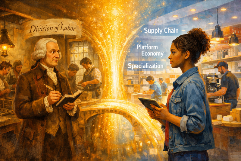 Please generate a 16:9 image in warm Enlightenment-era oil painting style blending into modern style, depicting panel 14 of 14. Make the characters and style consistent with the prior panels. The scene is a creative split: on the left, the 18th-century pin factory where Smith stands with his notebook. On the right, the same composition mirrored in a modern setting with super bright colors — a young diverse student standing in a contemporary workplace (a coffee shop, a logistics center, or a tech startup), holding a phone or tablet, observing how work is organized with the same curious expression Smith wore. Between them, a bridge of golden light connects past and present. Both figures are surrounded by floating annotations — Smith's "Division of Labor" on his side, modern terms like "Supply Chain," "Platform Economy," "Specialization" on the student's side. The color palette blends warm Enlightenment gold on the left with clean modern tones on the right, unified by the golden bridge. The emotional tone is inspiring — you can do what Smith did, right where you are. Generate the image now.Adam Smith's greatest lesson wasn't about markets or money — it was about paying attention. He walked into a factory and saw what thousands of people before him had overlooked. He watched a crowd lean with a tightrope walker and discovered the foundation of human morality. He observed butchers, bakers, and brewers and found the logic of an entire economic system. You have the same superpower. The next great economic insight is hiding in plain sight — in your school, your neighborhood, your phone, your part-time job. Economics starts with observing people. What patterns do you see?