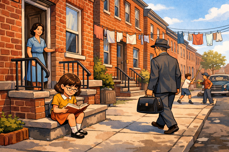 I am about to ask you to generate a series of images for a graphic novel. Please make the images have a consistent style and consistent characters. Do not ask any clarifying questions. Just generate the image immediately when asked to do so. Please generate a 16:9 image in clean modern illustration style with professional blues and grays depicting panel 1 of 14. The scene shows a working-class neighborhood in Bay Ridge, Brooklyn, in the early 1950s. A small girl with brown hair and glasses — young Janet Yellen, about 6 years old — sits on the front stoop of a modest row house, reading a book while the neighborhood bustles around her. Her father, Julius Yellen, a family doctor who makes house calls, is walking down the sidewalk carrying his black medical bag toward a neighbor's door. Her mother, Anna, stands in the doorway. The street is lined with brick row houses, laundry lines, and a few parked cars from the 1950s era. Other children play stickball in the street. The color palette is warm nostalgic tones — red brick, blue sky, warm sidewalk gray. The emotional tone is community, modesty, and quiet curiosity. Generate the image now.Janet Louise Yellen was born on August 13, 1946, in Brooklyn, New York — the daughter of a schoolteacher mother and a family doctor father who ran his practice out of the basement of their Bay Ridge home. Her father, Julius, treated patients regardless of their ability to pay, and young Janet watched families come through their front door worried about both their health and their finances. This early exposure to economic anxiety — to real people struggling with real problems — planted a seed that would shape her entire career. She grew up understanding that economics was never just about numbers on a page.
