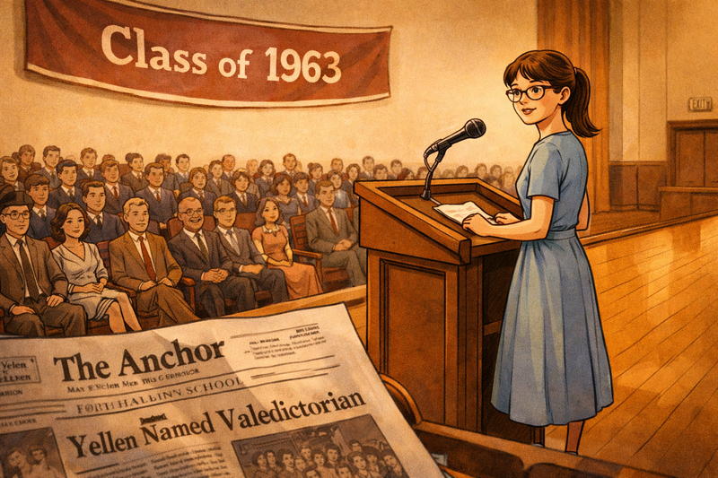 Please generate a 16:9 image in clean modern illustration style with professional blues and grays depicting panel 2 of 14. Make the characters and style consistent with the prior panel. The scene shows a young Janet Yellen, now about 17, at Fort Hamilton High School in Brooklyn, circa 1963. She stands at a podium in the school auditorium as class valedictorian, delivering a speech. She is thin, with brown hair pulled back, wearing a modest dress and glasses. The audience of students and parents fills the seats. On the wall behind her is a banner reading "Class of 1963." A copy of the school newspaper is visible in the foreground — she was the editor. The color palette is warm institutional tones — polished wood, cream walls, amber stage lighting. The emotional tone is quiet achievement — not flashy, but undeniably brilliant. Generate the image now.At Fort Hamilton High School, Janet was the kind of student who made everything look effortless. She served as editor of the school newspaper, graduated as class valedictorian, and earned admission to Brown University — no small feat for a girl from a working-class Brooklyn family in the early 1960s. Even then, she had an unusual combination of traits: intense intellectual curiosity paired with a modest, unassuming manner. Her teachers remembered her not as the loudest voice in the room, but as the most precise. She didn't need to shout to be right.