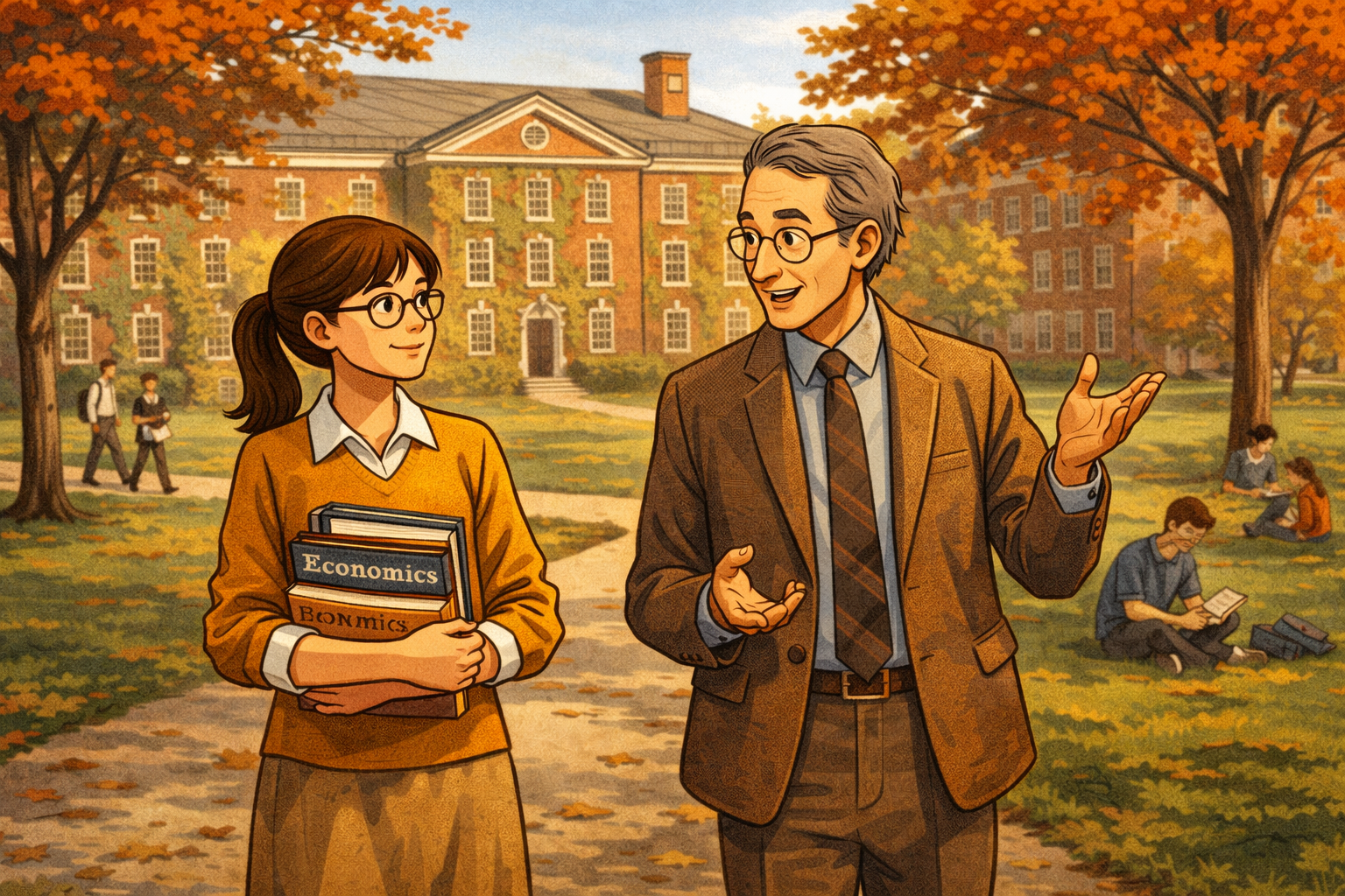Please generate a 16:9 image in clean modern illustration style with professional blues and grays depicting panel 3 of 14. Make the characters and style consistent with the prior panels. The scene shows the campus of Brown University, circa 1965. Janet Yellen, now about 19, walks across the ivy-covered quad carrying a stack of economics textbooks. She is in conversation with a professor who gestures enthusiastically while explaining a concept. In the background, the elegant Georgian-style buildings of Brown University are visible. Other students sit on the lawn studying. One of the textbooks visible in her arms reads "Economics" on the spine. The leaves on the trees are turning fall colors. The color palette is Ivy League autumn — deep reds, rich greens, warm stone, golden afternoon light. The emotional tone is intellectual awakening — the moment when a brilliant student finds her calling. Generate the image now.At Brown University, Janet initially considered philosophy and mathematics before discovering economics — a field that combined the rigor of math with questions about human welfare that she cared about deeply. She graduated summa cum laude in 1967, one of the few women in her economics classes. Her professors recognized something special: she had the rare ability to move fluidly between abstract mathematical models and the messy reality of how people actually live. Economics, she realized, was the discipline that could translate her father's kitchen-table compassion into policy that helped millions.