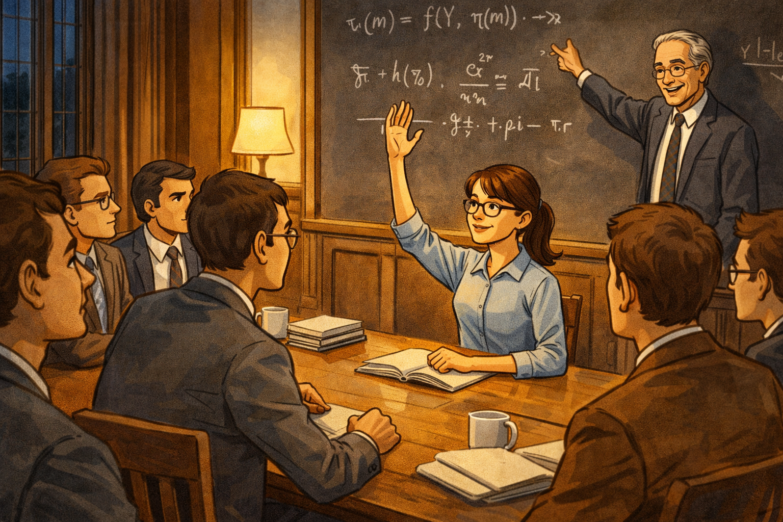 Please generate a 16:9 image in clean modern illustration style with professional blues and grays depicting panel 4 of 14. Make the characters and style consistent with the prior panels. The scene shows the interior of a Yale University economics seminar room, circa 1969. Janet Yellen, now in her early 20s with her hair in a practical style, sits at a long wooden table surrounded almost entirely by male graduate students in sport coats. She is the only woman in the room. At the head of the table, the Nobel laureate James Tobin — an older man with silver hair and kind eyes — leads the discussion, gesturing toward equations on a chalkboard. Yellen's hand is raised, her expression confident and focused. The male students look toward her with a mix of surprise and respect. The room has dark wood paneling, tall windows, and the gravitas of an elite institution. The color palette is Yale blue, dark wood, chalk white, and warm lamplight. The emotional tone is breaking barriers through sheer competence. Generate the image now.At Yale's graduate program, Yellen was often the only woman in the room — sometimes literally the only woman in the entire economics department. She studied under James Tobin, a Nobel Prize-winning economist who believed that government had a responsibility to fight unemployment. Tobin's influence was profound: he taught Yellen that monetary policy wasn't an abstract exercise but a tool that could determine whether millions of people had jobs or didn't. She earned her Ph.D. in 1971 with a dissertation on employment and wages. In a field dominated by men who rarely questioned their own assumptions, Yellen learned early that being underestimated could be an advantage.