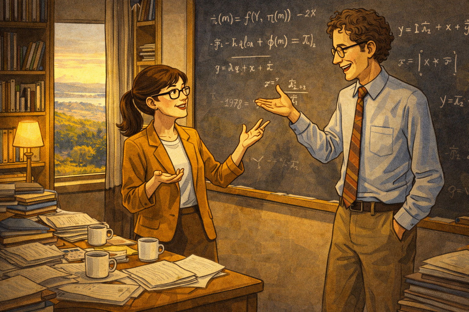 Please generate a 16:9 image in clean modern illustration style with professional blues and grays depicting panel 5 of 14. Make the characters and style consistent with the prior panels. The scene shows the economics department at the University of California, Berkeley, circa 1978. Janet Yellen, now in her early 30s, and George Akerlof — a tall, lanky man with curly hair, glasses, and an infectious grin — stand together at a chalkboard covered with equations. They are clearly in animated intellectual discussion, both gesturing at the board. Around them, the office is cluttered with papers and books. Through the window, the Berkeley hills and the bay are visible in golden California light. Coffee cups sit on the desk. The mood is warm and intellectually electric — two brilliant minds who are also clearly falling in love. The color palette is warm California tones — golden light, green hills, warm wood — contrasting with the cool precision of the equations. The emotional tone is partnership, both intellectual and personal. Generate the image now.After teaching at Harvard, Yellen joined the faculty at UC Berkeley, where she met George Akerlof — a brilliant, unconventional economist who would later win the Nobel Prize for his work on how imperfect information distorts markets. They married in 1978 and became one of the most remarkable intellectual partnerships in economics. They co-authored influential papers and challenged each other's thinking constantly. Together, they explored why wages don't fall during recessions the way simple models predict — work that would later inform Yellen's understanding of why unemployment is so devastating and so persistent. Their partnership proved that collaboration and love could coexist with rigorous scholarship.
