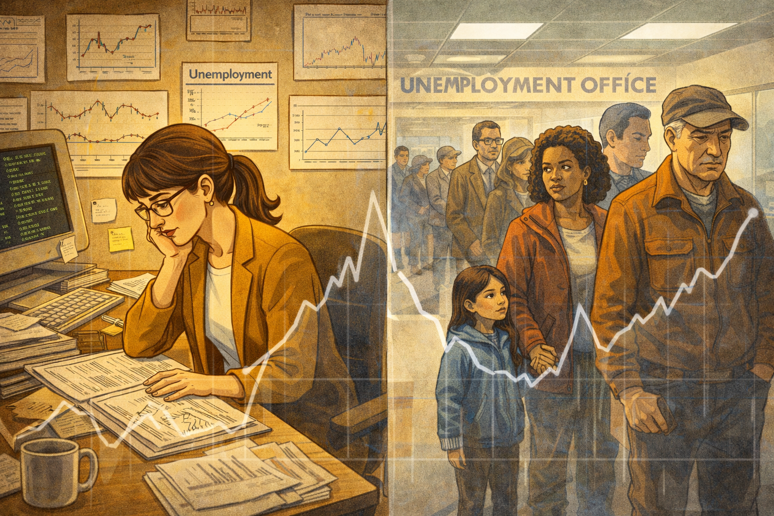 Please generate a 16:9 image in clean modern illustration style with professional blues and grays depicting panel 6 of 14. Make the characters and style consistent with the prior panels. This is a pivotal panel. The scene is a split composition. On the left, Janet Yellen sits in her Berkeley office in the 1980s, surrounded by charts and data on unemployment, a computer terminal showing early economic models, papers spread across her desk. She studies the data with intense concentration. On the right, the human reality her data represents: a line of people at an unemployment office — diverse faces showing worry, frustration, and dignity under pressure. A mother holds a child's hand. An older factory worker in work clothes stares at the floor. Connecting both halves is a translucent overlay of a line graph showing unemployment rates rising. The color palette contrasts the warm academic office on the left with the harsh fluorescent institutional tones on the right. The emotional tone is the bridge between data and humanity — Yellen's defining insight that every data point is a person. Generate the image now.Throughout the 1980s and early 1990s, Yellen built her academic reputation on a simple but powerful conviction: unemployment is not just a number. Her research explored why companies don't simply cut wages during downturns, why workers who lose jobs often can't find equivalent ones, and why the human cost of unemployment — depression, family breakdown, loss of skills — compounds over time in ways that standard models ignore. She became one of the leading voices arguing that the Federal Reserve should care as much about employment as about inflation. In a profession that often treated joblessness as an acceptable trade-off, Yellen insisted on asking: acceptable to whom?
