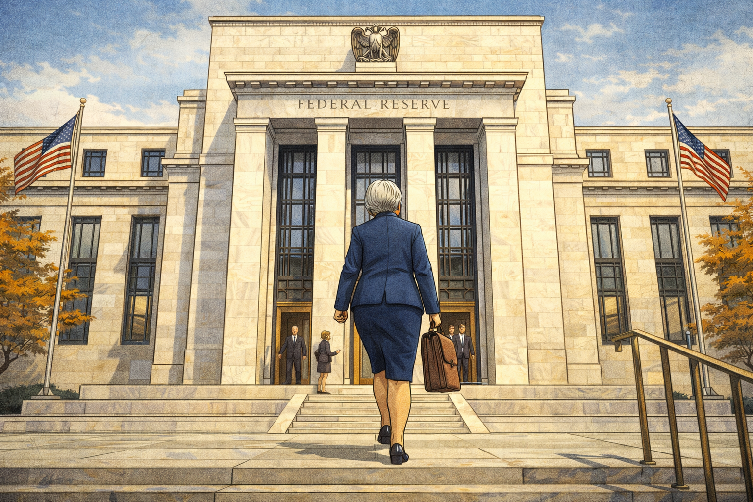 Please generate a 16:9 image in clean modern illustration style with professional blues and grays depicting panel 7 of 14. Make the characters and style consistent with the prior panels. The scene shows the imposing Eccles Building — the headquarters of the Federal Reserve in Washington, D.C. — on a crisp autumn day in 1994. Janet Yellen, now in her late 40s with graying hair and glasses, walks up the marble steps toward the entrance for the first time as a Federal Reserve Board Governor. She wears a professional navy blue suit and carries a leather briefcase. The building's neoclassical facade — massive marble columns, eagle sculptures, the inscription "Federal Reserve" — towers above her. A few staffers in suits hold the door. American flags flutter on either side. The color palette is institutional gravitas — marble white, navy blue, deep gray, polished brass. The emotional tone is crossing a threshold — a lifetime of preparation meeting the seat of monetary power. Generate the image now.In 1994, President Clinton appointed Yellen to the Federal Reserve Board of Governors, bringing her from the classroom to the center of American monetary policy. The Fed was an institution steeped in tradition, hierarchy, and a certain kind of masculine confidence — a world of dark suits, mahogany tables, and carefully guarded authority. Yellen entered this world with her characteristic calm, her briefcase full of data, and a determination to ensure that the Fed's decisions reflected the real economy, not just financial markets. She quickly earned a reputation as the most prepared person at every meeting — someone who read every memo, questioned every assumption, and never lost sight of the workers behind the statistics.