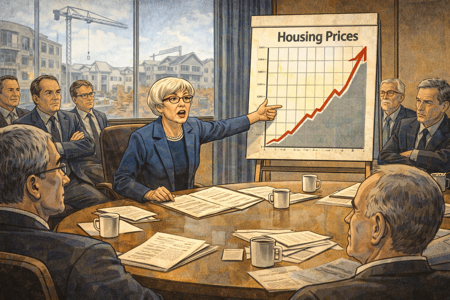 Please generate a 16:9 image in clean modern illustration style with professional blues and grays depicting panel 8 of 14. Make the characters and style consistent with the prior panels. The scene shows a Federal Reserve meeting room in 2005. Janet Yellen, now president of the San Francisco Federal Reserve, sits at a large conference table surrounded by other Fed officials — mostly men in dark suits. She is speaking urgently, pointing to a chart showing the explosive growth of housing prices. On the chart, a housing price line shoots upward at an alarming angle. Other officials around the table look skeptical or dismissive — some lean back with arms crossed, others exchange glances. Through the window behind them, a construction crane and new housing development are visible. The color palette is institutional blues and grays with the alarming red of the rising chart line. The emotional tone is Cassandra-like frustration — seeing the danger clearly while others refuse to listen. Generate the image now.As president of the San Francisco Federal Reserve Bank starting in 2004, Yellen had a front-row seat to the housing bubble inflating across the American West. She saw the reckless lending, the exotic financial products no one fully understood, and the homeowners taking on mortgages they could never repay. In Fed meetings, she warned repeatedly that the housing market was dangerously overheated and that the financial system was more fragile than it appeared. Many of her colleagues dismissed these concerns — the prevailing wisdom held that markets were self-correcting and that sophisticated financial instruments had made the system safer. Yellen's data told a different story, and history would prove her right.