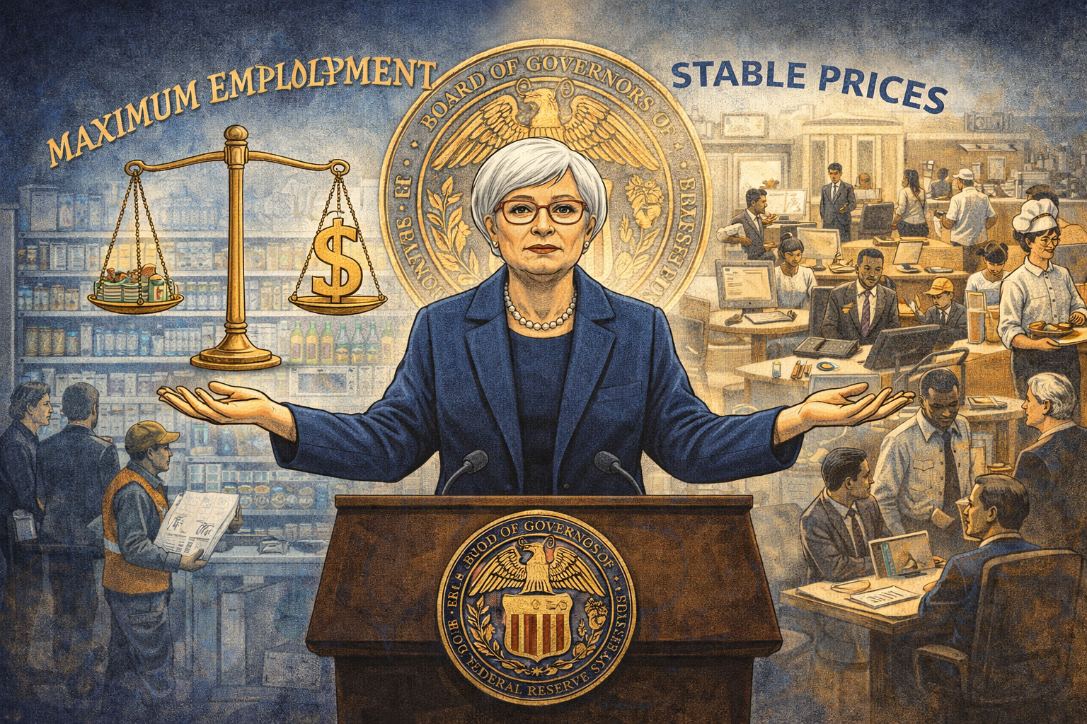 Please generate a 16:9 image in clean modern illustration style with professional blues and grays depicting panel 10 of 14. Make the characters and style consistent with the prior panels. The scene is a visual essay showing the Federal Reserve's dual mandate. In the center, Janet Yellen stands at a podium with the Federal Reserve seal behind her. On her left side, a visual metaphor for price stability: a balanced scale with a dollar sign, prices steady, grocery store shelves full. On her right side, a visual metaphor for maximum employment: a bustling workplace with diverse workers — a construction site, an office, a restaurant — people earning and providing for their families. Yellen holds both sides in balance, her hands outstretched. Above her, the text "MAXIMUM EMPLOYMENT" and "STABLE PRICES" arc like the two sides of a coin. The color palette is Federal Reserve blue and gold, with warm human tones on the employment side and precise cool tones on the stability side. The emotional tone is the weight of responsibility — balancing two vital goals that sometimes pull in opposite directions. Generate the image now.The Federal Reserve has two mandates from Congress: maintain stable prices and promote maximum employment. For decades, many economists and Fed officials prioritized inflation control, sometimes treating unemployment as a necessary cost of keeping prices steady. Yellen challenged this imbalance throughout her career. She argued that both mandates deserve equal weight — that a world with low inflation but mass unemployment is not a success. During the recovery from 2008, she advocated for keeping interest rates low long enough for the labor market to truly heal, even when critics warned about inflation. Her patience proved prescient: unemployment fell steadily while inflation remained contained. The recovery she helped engineer, though painfully slow, prevented catastrophe.