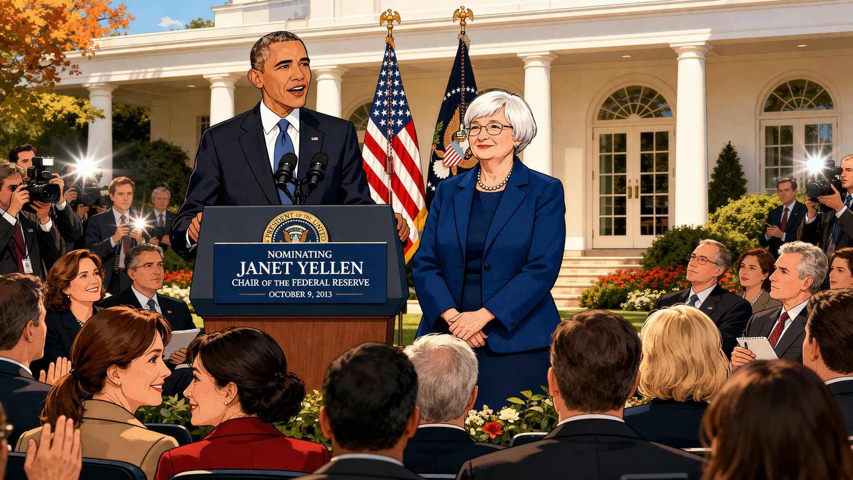 Please generate a 16:9 image in clean modern illustration style with professional blues and grays depicting panel 11 of 14. Make the characters and style consistent with the prior panels. The scene shows the White House Rose Garden on October 9, 2013. President Barack Obama stands at a podium announcing Janet Yellen's nomination as Chair of the Federal Reserve — the first woman ever nominated for the position. Yellen stands beside him, composed and dignified, with a slight smile. Behind them, the White House colonnade is visible. In the audience, reporters, officials, and staff watch the historic moment. A few women in the crowd exchange looks of pride. Camera flashes illuminate the scene. The color palette is White House formal — green lawn, white columns, autumn sky, dark suits with Yellen's signature blue. The emotional tone is historic breakthrough — quiet triumph after decades of proving herself in rooms full of men who underestimated her. Generate the image now.On October 9, 2013, President Obama nominated Janet Yellen to chair the Federal Reserve — the most powerful economic policy position in the world. She would be the first woman to hold the job in the Fed's hundred-year history. The nomination was not a gesture; it was the recognition of decades of brilliance, preparation, and results. When she was confirmed and took office in February 2014, she brought something new to the role: a deep, research-backed empathy for working people. In her first speech as Chair, she told the stories of individual unemployed Americans by name. The message was clear: the Chair of the Federal Reserve would never forget that behind every statistic was a human being.