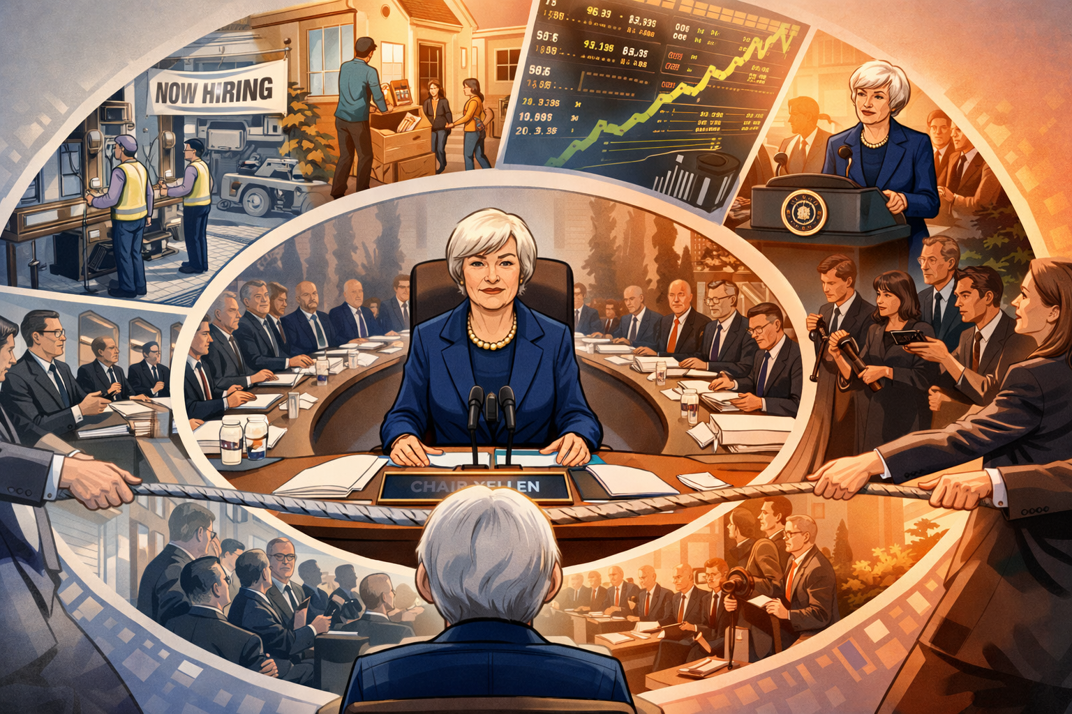 Please generate a 16:9 image in clean modern illustration style with professional blues and grays depicting panel 12 of 14. Make the characters and style consistent with the prior panels. The scene shows a montage of Yellen's tenure as Fed Chair, 2014-2018. In the center, Yellen sits at the head of the Federal Open Market Committee table, presiding over a meeting. Around her in spiral vignettes: a factory reopening with a "NOW HIRING" banner, a family moving into a new home, a stock market ticker showing steady gains, a press conference where Yellen patiently explains policy to reporters. At the edges, political critics from both sides — hawks who wanted higher rates and doves who wanted more stimulus — pull in opposite directions, but Yellen holds the center with steady hands. The color palette shows gradual warming — from the cool crisis grays of earlier panels toward warmer, more optimistic tones. The emotional tone is steady leadership — the unglamorous, patient work of guiding an economy back to health. Generate the image now.As Fed Chair, Yellen navigated one of the most complex economic recoveries in history. She faced relentless pressure from all sides: conservatives demanded she raise interest rates immediately to prevent inflation, while progressives urged even more aggressive stimulus. Yellen chose a middle path guided by data, not ideology. She began gradually raising rates in 2015 — the first increase in nearly a decade — but only after confirming that the labor market had genuinely strengthened. During her tenure, unemployment fell from 6.7% to 4.1%, the economy added over 8 million jobs, and inflation remained historically low. It was not dramatic or headline-grabbing work. It was patient, careful, and effective.