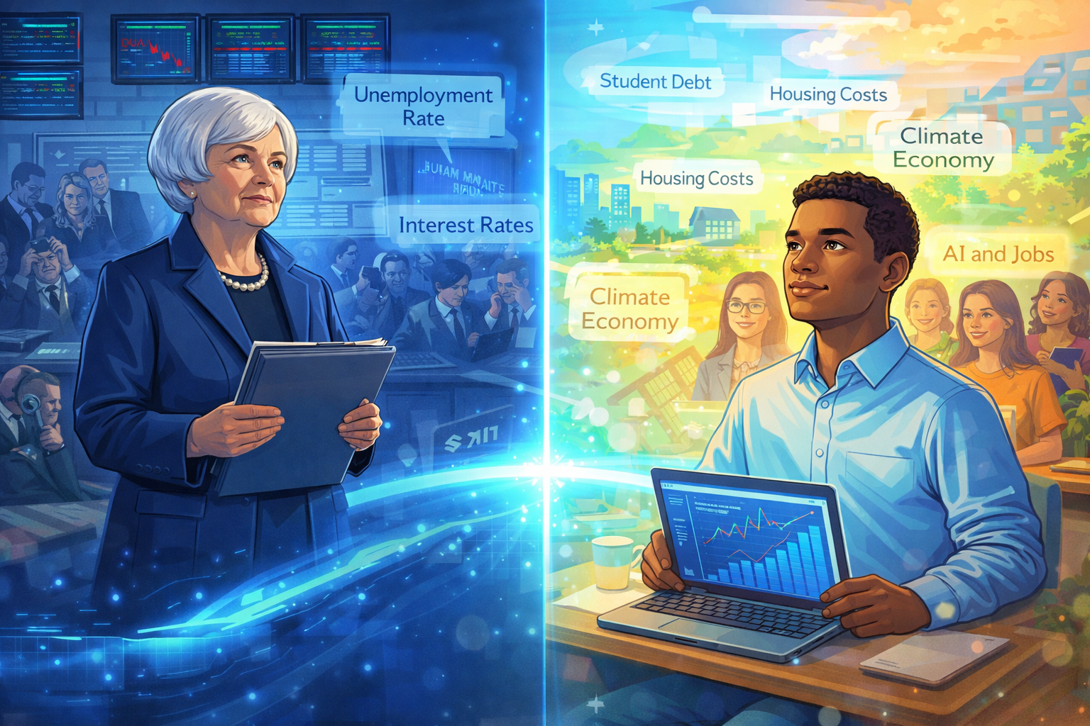 Please generate a 16:9 image in clean modern illustration style blending into a bright contemporary style, depicting panel 14 of 14. Make the characters and style consistent with the prior panels. The scene is a creative split: on the left, the Federal Reserve boardroom during the 2008 crisis — screens showing falling markets, officials in distress, and Janet Yellen standing calm with her data folder. On the right, the same composition mirrored in a modern setting with super bright colors — a young diverse student sitting in an economics classroom or at a community meeting, holding a laptop showing economic data, looking up with the same thoughtful, determined expression Yellen wears. Between them, a bridge of steady blue light connects past and present. Both figures are surrounded by floating annotations — Yellen's side shows "Unemployment Rate," "Interest Rates," "Dual Mandate," while the student's side shows "Student Debt," "Housing Costs," "Climate Economy," "AI and Jobs." The color palette blends the institutional blues and grays on the left with bright, hopeful modern tones on the right, unified by the blue bridge. The emotional tone is inspiring — you can bring the same calm, data-driven compassion to the economic challenges of your generation. Generate the image now.Janet Yellen's greatest lesson isn't about interest rates or monetary policy — it's about listening. She listened to the data when others were listening to ideology. She listened to the unemployed when others were listening to the markets. She listened to the warning signs of crisis when others were listening to the cheerful hum of a bubble. And she did all of this while being told, again and again, that she didn't belong in the room. You have the same capacity. The next great economic insight won't come from someone who shouts the loudest — it will come from someone who listens the most carefully, who looks at the data with clear eyes, and who never forgets that behind every number is a person. What are you listening for?