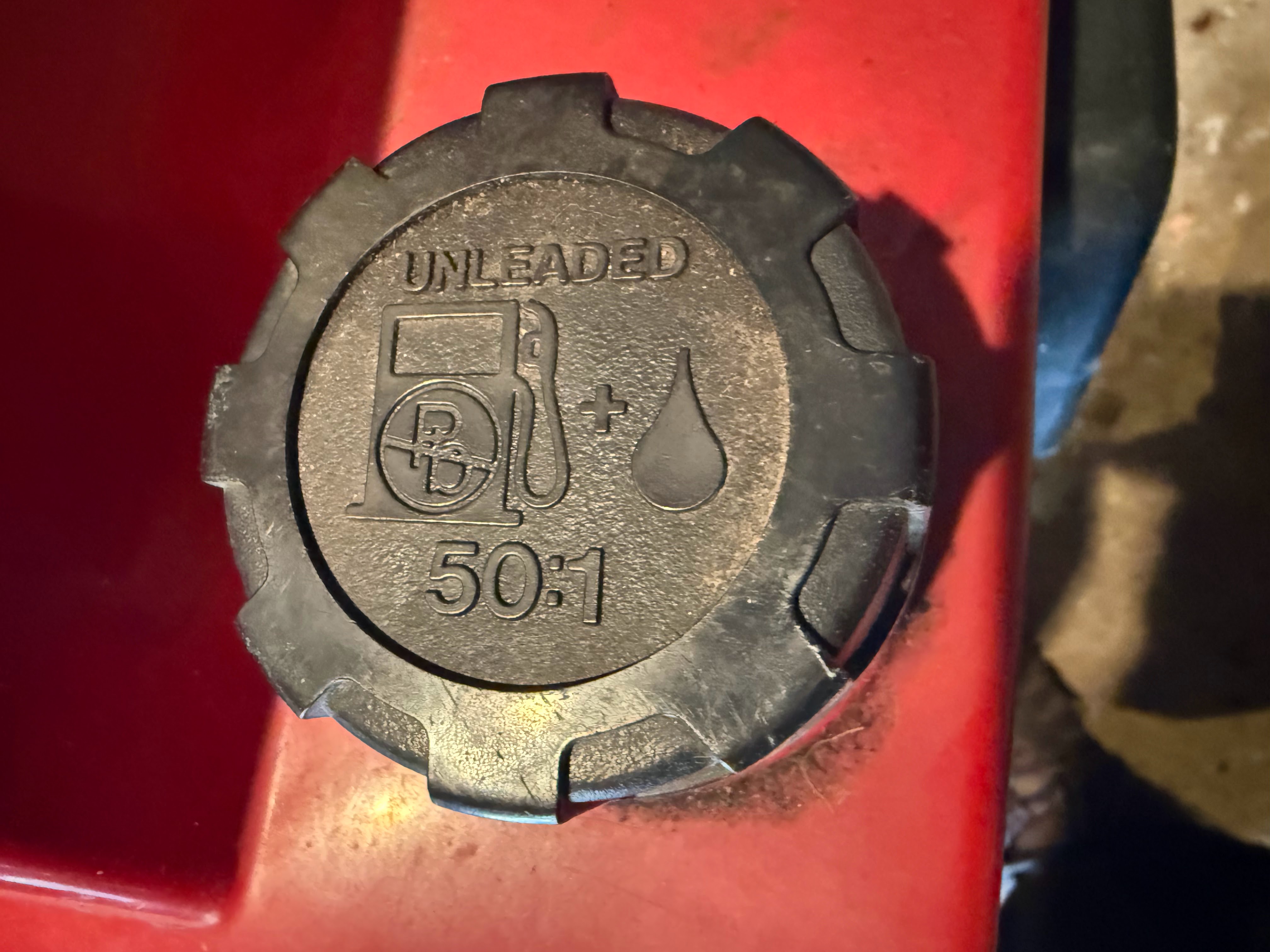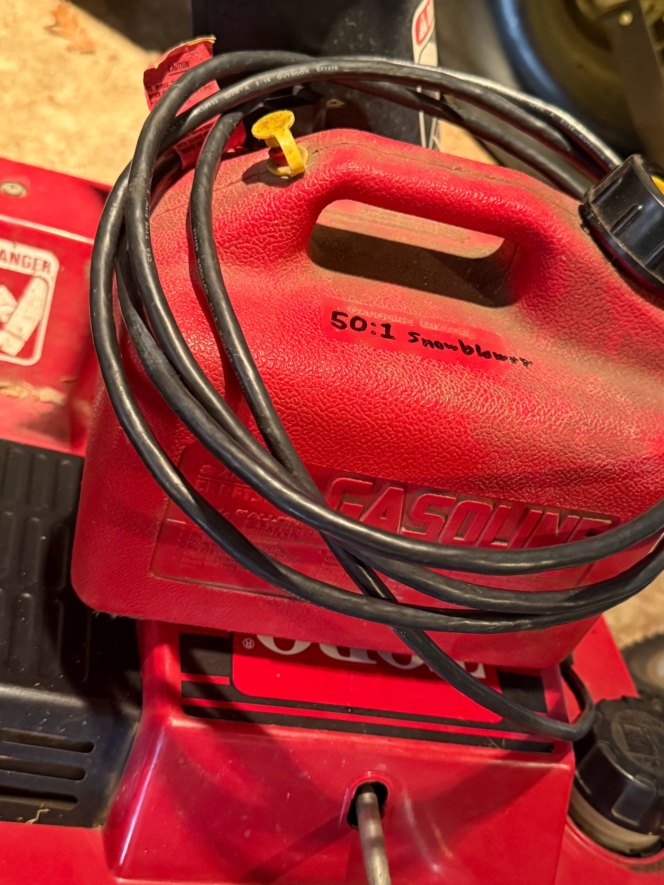 This is an image of the gas cap on the snowblower. You will note that it indicates that the proper mixture is 50 to 1.