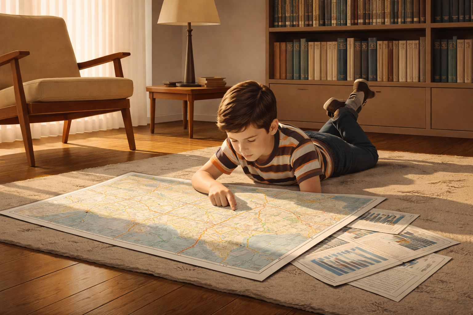 Please generate a 16:9 image in clean modernist illustration style depicting Panel 1. The scene shows a boy of about 10 years old lying on his stomach on a hardwood floor in a 1950s American living room in Kansas City. He is studying a large unfolded road map spread before him, tracing routes with his finger. Beside him are open issues of Scientific American magazine showing charts and diagrams. The room has mid-century furniture — a Danish modern chair, a floor lamp with a conical shade. Warm afternoon light streams through a window, casting long shadows. A bookshelf in the background is packed with encyclopedias. The color palette is warm honey tones, cream, and soft brown with touches of the map's blue highways and red state lines. The emotional tone is wonder and quiet absorption — a mind discovering that information can be beautiful.Young Edward Tufte grew up in the 1950s surrounded by information. His father, a city official, brought home reports filled with tables and charts, and the boy was fascinated — not by the numbers themselves, but by how they were arranged on the page. He spent hours with road maps and Scientific American magazines, noticing that some layouts made ideas leap off the page while others buried them in confusion. Even then, he sensed that the way you show information changes what people understand.