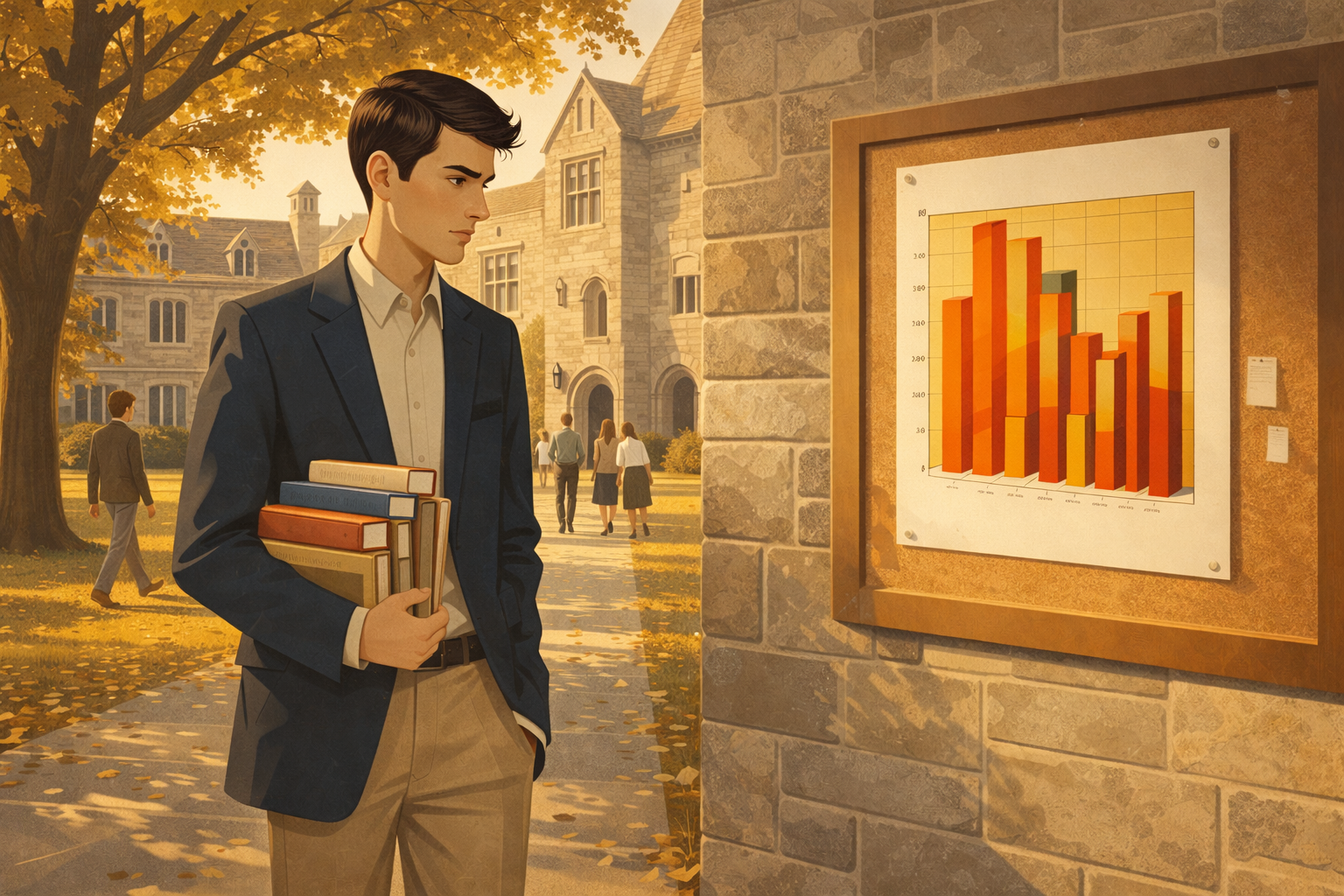 Image 2 Please generate a 16:9 image in clean modernist illustration style depicting Panel 2. The scene shows a young man in his early 20s, tall and thin with dark hair, walking across a sunlit Ivy League campus in the early 1960s. He carries a stack of books under one arm — statistics texts and political science journals. The architecture is collegiate Gothic with stone buildings and arched windows. Other students in early-1960s clothing walk in the background. A large oak tree frames one side of the composition. On a bulletin board near a doorway, a poorly designed bar chart poster is visible, with garish colors and unnecessary 3D effects. The young Tufte glances at it with a slight frown. Color palette: autumn golds, deep greens, warm stone gray, with the ugly poster in clashing reds and yellows as a contrast. Emotional tone: intellectual ambition mixed with a growing critical eye.Tufte earned his undergraduate degree from Stanford and then a PhD from Yale, studying political science and statistics. He was trained to analyze data rigorously, but he noticed something troubling: the academic world was full of terrible charts. Presentations used garish colors, misleading scales, and decorative clutter that obscured the very data they were supposed to reveal. The young scholar began to ask a question that would define his life's work — why does everyone accept bad graphics when good ones could change the way people think?