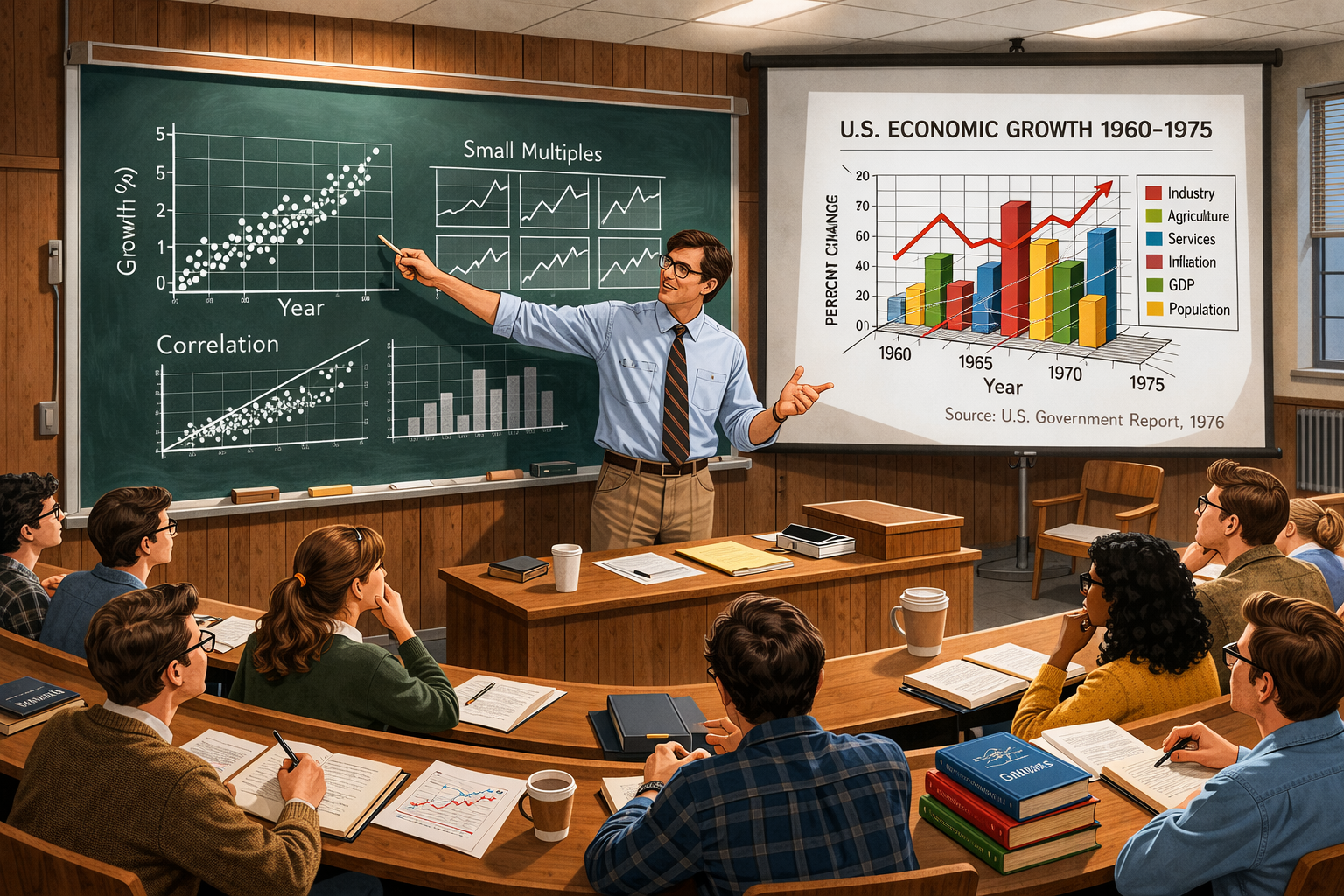 Image 3 Please generate a 16:9 image in clean modernist illustration style depicting Panel 3. The scene is a 1970s Yale University lecture hall. A professor in his early 30s (Tufte) stands at a chalkboard filled with hand-drawn statistical graphics — clean scatter plots, well-labeled axes, small multiples arranged in a grid. He gestures passionately to a seated audience of graduate students who lean forward with interest. The chalkboard drawings are precise and elegant, contrasting with a projected slide on a screen beside him showing a cluttered, poorly designed government report chart with unnecessary gridlines, excessive labeling, and a gratuitous 3D effect. The room has 1970s wood paneling, fluorescent lighting, and institutional carpet. Color palette: classroom browns and greens, chalk-white lines on dark green board, with the projected bad chart in muddy institutional colors. Emotional tone: passionate teaching and intellectual clarity cutting through mediocrity.As a young professor at Yale, Tufte began teaching a course on statistical graphics that would become legendary. He didn't just teach students how to make charts — he taught them how to see. He showed them Minard's famous map of Napoleon's march to Moscow and asked, "How does one image convey six variables at once?" He showed them government reports drowning in chartjunk and asked, "What would happen if we removed everything that doesn't tell you something new?" His students began to realize that information design wasn't decoration — it was an act of respect for the audience.