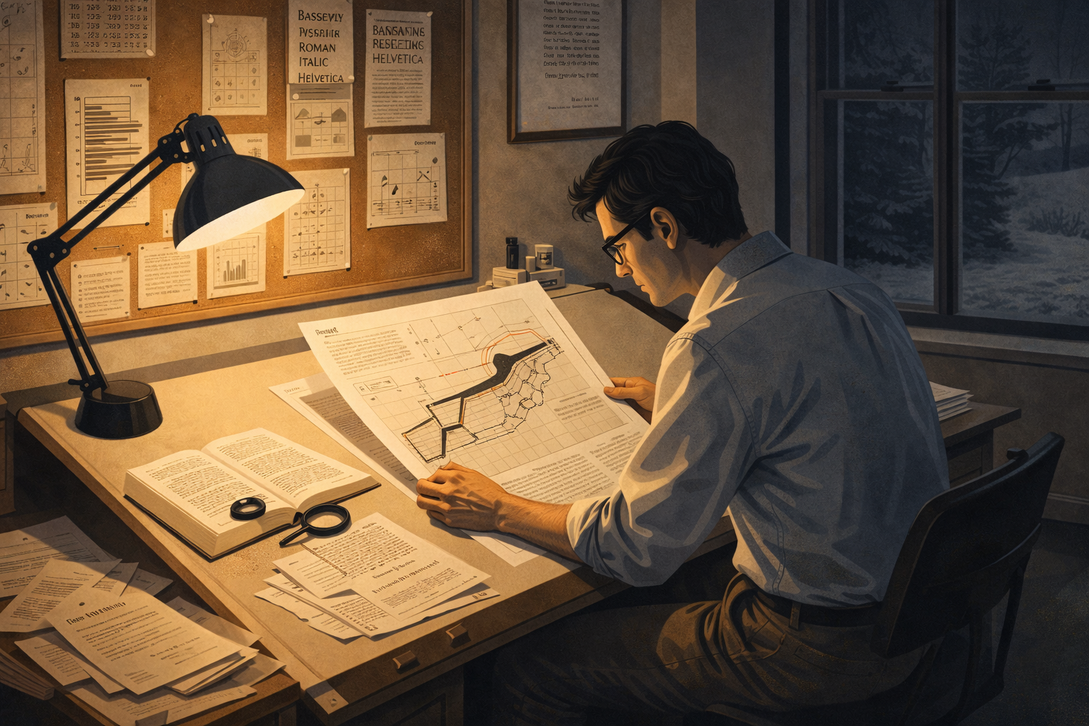 Image 4 Please generate a 16:9 image in clean modernist illustration style depicting Panel 4. The scene shows a man in his early 40s sitting at a large drafting table in a home study, late at night, circa 1982. He is surrounded by manuscript pages, typographic specimens, and printed chart examples pinned to cork boards on the walls. A high-quality typography book lies open beside a magnifying loupe. He is carefully examining a proof sheet of a page layout showing a Minard-style data graphic reproduced at high resolution. An Anglepoise desk lamp illuminates the work area in warm golden light while the rest of the room is in shadow. Through a window, a Connecticut winter landscape is faintly visible. On the desk, rejection letters from publishers are stacked to one side, some crumpled. Color palette: warm lamplight gold, deep shadow blue-gray, cream paper, black ink. Emotional tone: solitary determination and meticulous care.By the early 1980s, Tufte had compiled years of research into a manuscript that would become The Visual Display of Quantitative Information. But when he approached publishers, they balked. The book demanded exceptional production quality — high-resolution reproductions of historical graphics, precise typography, and careful color printing. Publishers wanted to cut costs: use cheaper paper, reduce the illustrations, simplify the layout. Tufte refused. If a book about visual excellence looked mediocre, it would undermine its own argument. The rejection letters piled up.