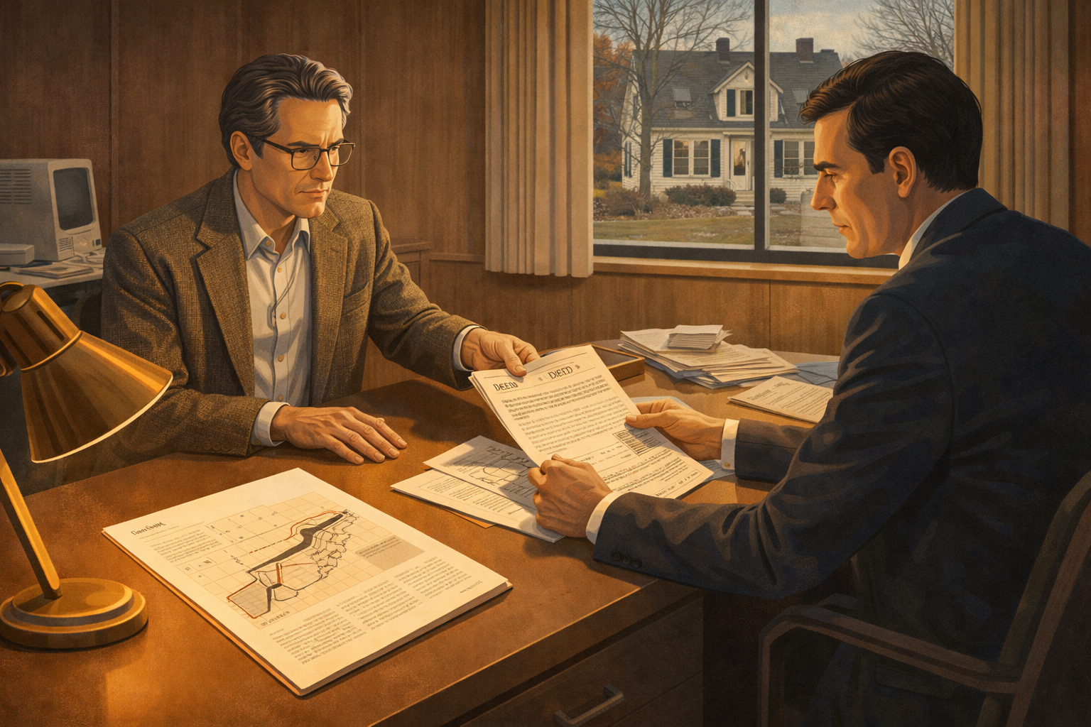 Image 5 Please generate a 16:9 image in clean modernist illustration style depicting Panel 5. The scene shows a tense moment in a bank office in Connecticut, early 1983. Edward Tufte, in his early 40s with silver-streaked hair and wearing a tweed jacket, sits across a desk from a bank loan officer in a suit. Tufte is sliding house deed documents across the desk. The loan officer looks skeptical, reviewing the documents with raised eyebrows. Through the bank's window, a modest but charming New England home is visible — the house being mortgaged. On the desk between them sits a beautifully typeset manuscript page showing an elegant data visualization. The bank interior has early-1980s decor — wood paneling, a brass desk lamp, a computer terminal in the corner. Color palette: institutional browns and tans, with the manuscript page glowing cream-white as the brightest element in the frame. Emotional tone: high-stakes courage and quiet resolve in the face of doubt.What Tufte did next stunned everyone who knew him. He took out a second mortgage on his home — borrowing roughly $180,000 — to self-publish the book himself. Friends and colleagues thought he was reckless. But Tufte understood something they didn't: the medium was the message. A book arguing for visual excellence had to be visually excellent. He hired the finest typographers, chose premium paper stock, and oversaw every detail of production personally. It was the biggest gamble of his life.