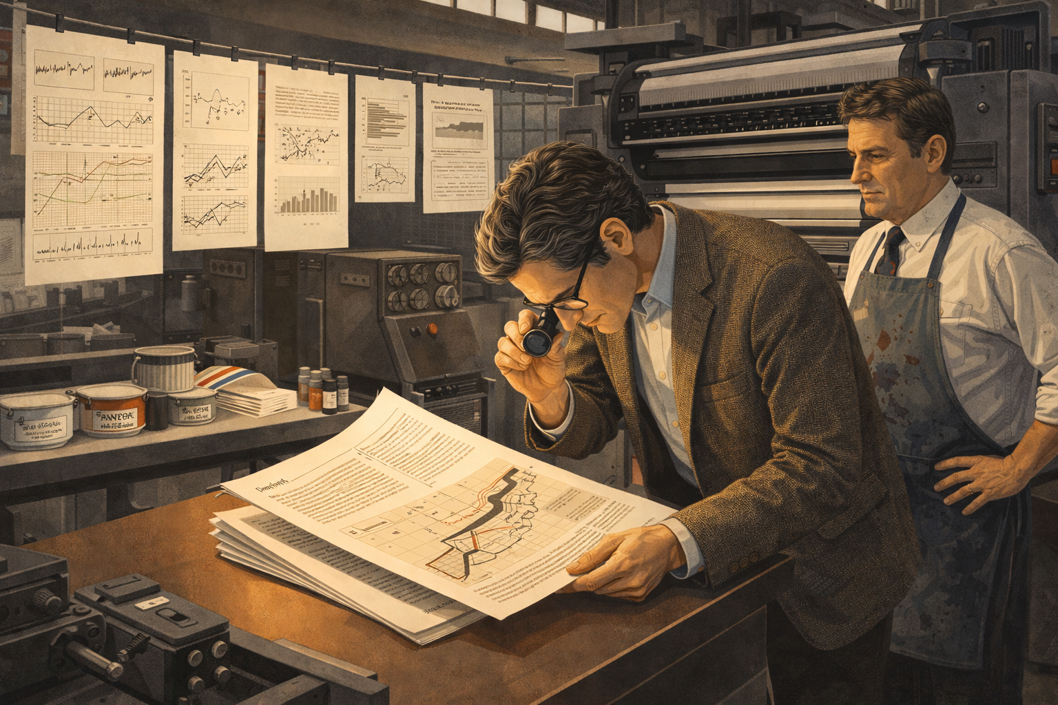 Panel 6 Please generate a 16:9 image in clean modernist illustration style depicting Panel 6. The scene shows a professional print shop in 1983. Edward Tufte stands beside a large offset printing press, examining a freshly printed signature (a folded section of pages) with a jeweler's loupe. A press operator in an ink-stained apron watches nearby. Sheets of beautifully printed pages hang on a drying line overhead, showing elegant statistical graphics — sparklines, scatter plots, and reproductions of historical charts. The printing press machinery is industrial and imposing. Ink cans and Pantone color guides sit on a nearby shelf. The printed pages are crisp cream with precise black ink and subtle color accents. Color palette: industrial grays and blacks of the machinery contrasting with the warm cream and precise lines of the printed pages. Emotional tone: craftsmanship and exacting standards meeting industrial production.Tufte threw himself into the production process with obsessive precision. He visited the print shop repeatedly, checking color registration, paper grain, and ink density. He insisted that every reproduction of a historical graphic be printed at the highest possible resolution so readers could study the fine details. He selected typefaces with the care of a Renaissance printer. The result was not just a book about good design — it was a physical embodiment of good design. Every page practiced what Tufte preached.
