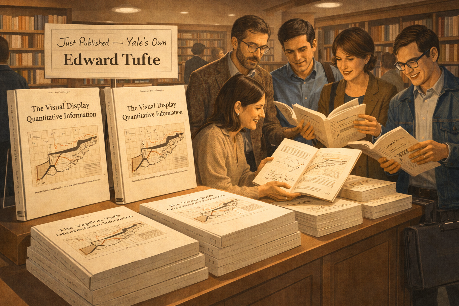 Please generate a 16:9 image in clean modernist illustration style depicting Panel 7. The scene shows a university bookstore in 1983, with copies of "The Visual Display of Quantitative Information" prominently displayed on a front table. The book has a clean, elegant cream cover with a reproduction of a time-series chart. A group of people — professors, graduate students, a graphic designer with a portfolio case — cluster around the display, picking up copies and flipping through pages with expressions of amazement and delight. One person holds a copy open to show a friend the Minard Napoleon chart reproduction. The bookstore has warm wooden shelves, soft overhead lighting, and an academic atmosphere. A hand-written sign reads "Just Published — Yale's Own Edward Tufte." Color palette: warm bookstore amber, cream of the book covers, rich browns of wooden shelves. Emotional tone: the excitement of discovery and word-of-mouth spreading.When The Visual Display of Quantitative Information appeared in 1983, there was no advertising campaign, no publisher's marketing machine. The book spread by word of mouth — and it spread like fire. Statisticians, journalists, designers, engineers, and government analysts all recognized that someone had finally articulated what they'd always felt: most charts were badly made, and it didn't have to be that way. The book introduced concepts that would become part of the design vocabulary forever — data-ink ratio, chartjunk, small multiples, and sparklines.
