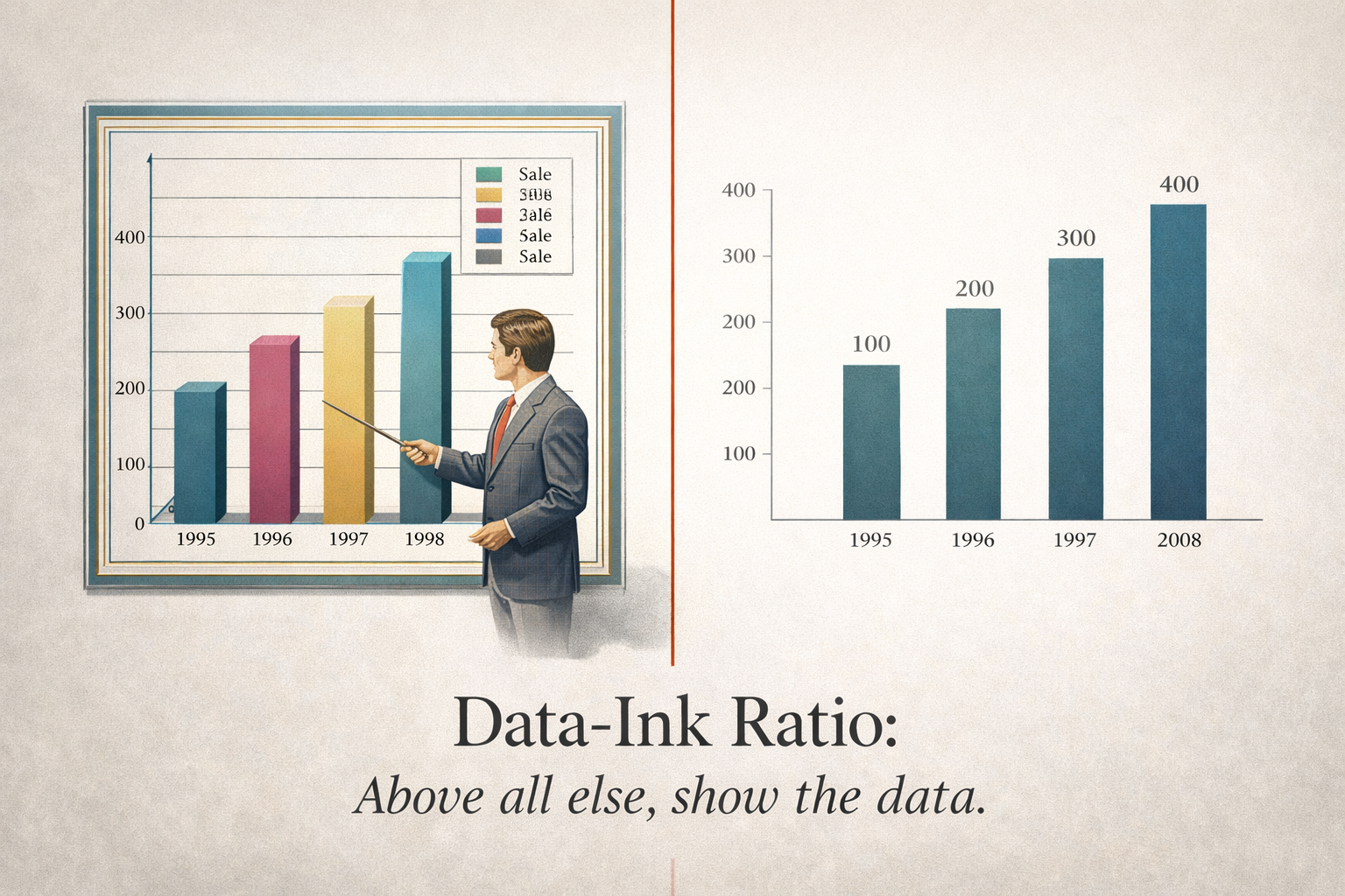 Panel 8 Please generate a 16:9 image in clean modernist illustration style depicting Panel 8. The scene is a split composition showing the concept of "data-ink ratio." On the left half, a cluttered 1980s business chart: a 3D bar chart with gradient fills, unnecessary gridlines, a decorative border, drop shadows, a legend that repeats information already on the axes, and a clip-art businessman pointing at the bars. On the right half, the same data presented as a clean, minimal bar chart: thin black bars on white, direct labels, no gridlines, no border, no decoration — just data and ink that tells the truth. A thin red line divides the two halves. At the bottom, elegant serif text reads "Data-Ink Ratio: Above all else, show the data." Color palette: the left side uses garish 1980s business colors (teal, magenta, gold gradients); the right side uses restrained black, cream, and a single blue accent. Emotional tone: the satisfying clarity of removing everything unnecessary.At the heart of Tufte's philosophy was a deceptively simple idea: maximize the data-ink ratio. Every drop of ink on a chart should present new information. If removing an element doesn't reduce the data being communicated, that element is chartjunk — visual clutter that makes the reader work harder for no benefit. This wasn't just an aesthetic preference. Tufte showed with rigorous examples that chartjunk actively misleads people, distorting perception and hiding patterns. Clarity wasn't about making things pretty — it was about making things true.