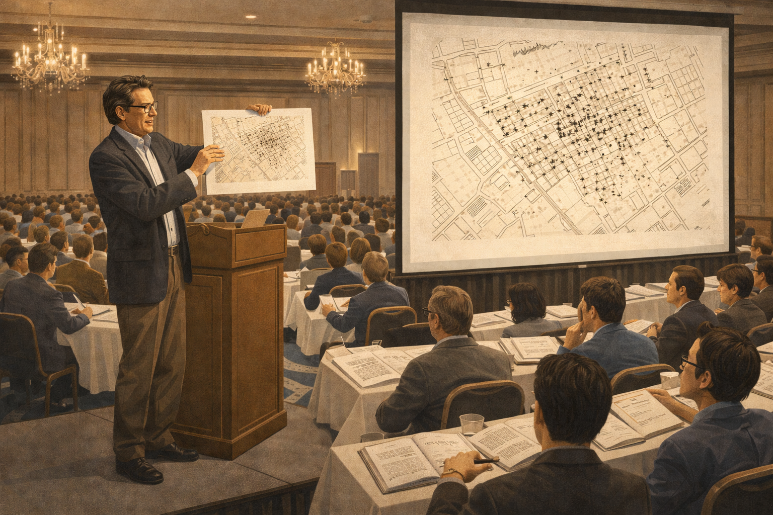 Please generate a 16:9 image in clean modernist illustration style depicting Panel 9. The scene shows Edward Tufte, now in his late 40s, standing on a stage in a large hotel ballroom before an audience of 300+ professionals, circa late 1980s. He holds up a large printed example — a beautiful reproduction of John Snow's 1854 cholera map of London. Behind him, a projection screen shows the same image enlarged. The audience members sit at tables with copies of Tufte's books open before them, along with printed course materials. Some audience members are sketching in notebooks. The ballroom has chandeliers and hotel conference decor. Tufte is animated, gesturing at the map with obvious passion. Color palette: conference-room neutrals (gray carpet, white tablecloths) with the warm cream of the books and the detailed map image as focal points. Emotional tone: intellectual evangelism and an audience being transformed.Tufte didn't stop at books. He began offering one-day courses on information design — intense, six-hour seminars where he walked attendees through the principles of visual excellence. He brought original printings of historical graphics. He handed out copies of his books as course materials. The courses became legendary, attracting engineers from NASA, journalists from the New York Times, designers from Apple, and analysts from Wall Street. Over the decades, hundreds of thousands of people would attend. Tufte was building a movement, one converted mind at a time.