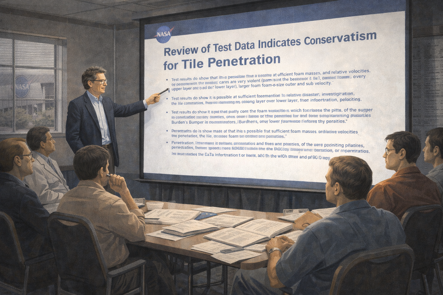 Please generate a 16:9 image in clean modernist illustration style depicting Panel 10. The scene shows a somber meeting room at NASA, circa 2003. On a large screen, the infamous PowerPoint slide from the Columbia disaster investigation is displayed — the slide with dense, confusing bullet points about foam debris impact analysis, with critical information buried in sub-sub-bullets. Edward Tufte stands to one side, pointing at the slide with a serious expression. Several NASA engineers in polo shirts and khakis sit around a conference table, some with troubled expressions. Papers and technical reports are spread on the table. Through a window, a NASA building exterior is faintly visible. Color palette: institutional grays and blues, harsh fluorescent lighting, the PowerPoint slide glowing in sterile white and blue on the screen. Emotional tone: grave seriousness — the realization that bad information design can have fatal consequences.Tufte's most sobering contribution came after the Space Shuttle Columbia disaster in 2003. He analyzed the PowerPoint slides that NASA engineers had used to assess the danger of foam debris striking the shuttle's wing during launch. The critical finding — that the damage could be catastrophic — was buried deep in a hierarchy of bullet points, its urgency lost in the format's inherent fragmentation. Tufte argued powerfully that the slide format itself contributed to the disaster by making it impossible to see the data clearly. Information design, he showed the world, is not just about aesthetics. Sometimes it is a matter of life and death.