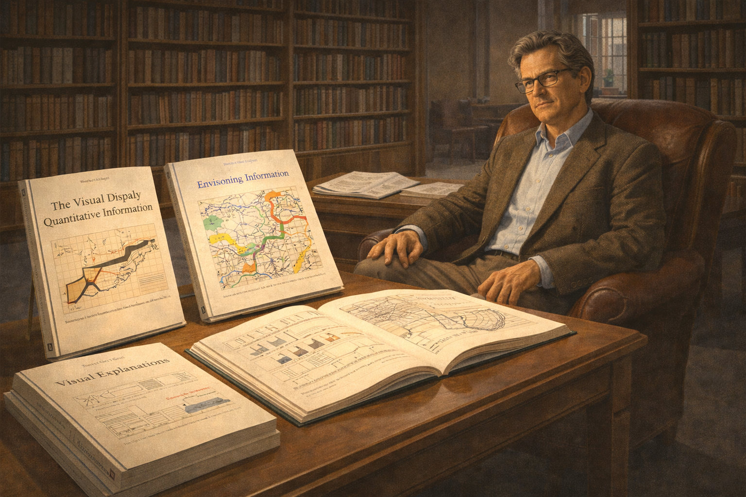 Please generate a 16:9 image in clean modernist illustration style depicting Panel 11. The scene shows a library or study filled with beautiful books. Edward Tufte, now in his 50s with distinguished silver hair, sits in a leather chair surrounded by three of his published masterworks arranged on a reading table: "The Visual Display of Quantitative Information," "Envisioning Information," and "Visual Explanations." Each book is open to a different iconic page — one showing sparklines, one showing a colorful map from Envisioning Information, one showing a scientific diagram. The room has floor-to-ceiling bookshelves, warm wood tones, and the quality of light you find in a fine rare-books room. A fourth manuscript in progress sits on a nearby desk. Color palette: rich library browns, deep greens, warm cream of premium book paper, with touches of color from the graphics reproduced in the open books. Emotional tone: the satisfaction of a life's work taking form across multiple volumes.Over two decades, Tufte produced four landmark books that together form the canon of information design. The Visual Display of Quantitative Information (1983) established the principles. Envisioning Information (1990) explored how to represent complex, multivariate data on the flat surface of a page. Visual Explanations (1997) examined how images convey dynamics, mechanism, and causality. Beautiful Evidence (2006) synthesized his thinking about how evidence is presented and consumed. Each book was self-published to Tufte's exacting standards. Together, they sold over two million copies.