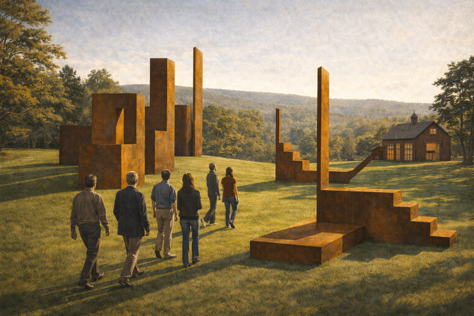 Please generate a 16:9 image in clean modernist illustration style depicting Panel 12. The scene shows a large outdoor sculpture installation on rolling green hills in Woodbury, Connecticut. Massive weathered steel sculptures — abstract geometric forms inspired by data patterns — rise from the landscape. Edward Tufte, now in his 60s, walks among the sculptures with a small group of visitors. The sculptures cast long afternoon shadows across the grass. In the background, a converted barn serves as a gallery space. Trees frame the scene. The sculptures have the quality of Richard Serra's work — monumental, austere, mathematically precise. One sculpture suggests the form of a three-dimensional graph. Color palette: oxidized steel oranges and browns, deep green grass, blue New England sky, warm afternoon golden light. Emotional tone: the expansion of a visual thinker beyond the page into physical space.In later years, Tufte expanded his vision beyond two dimensions. He became a sculptor, creating large-scale works in weathered steel at his property in Woodbury, Connecticut, which he opened as a public art space. The sculptures embodied the same principles as his graphics — they were precise, information-rich, and stripped of unnecessary ornament. For Tufte, the work was a natural extension: whether on a page or in a field, the goal was the same — to present truth clearly and let the viewer's intelligence do the rest. He had spent his career trusting his audience, and now he trusted them in physical space.