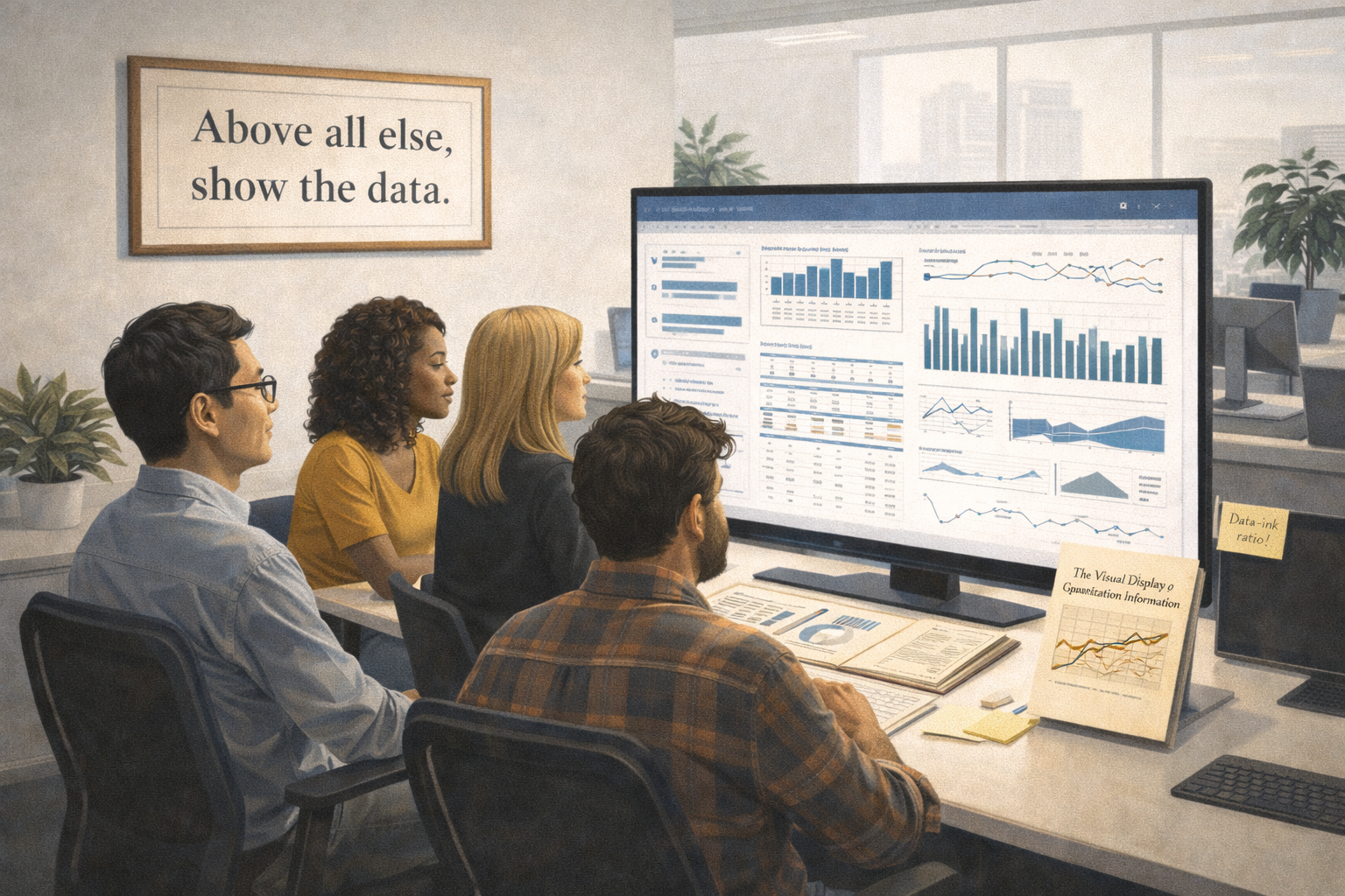 Please generate a 16:9 image in clean modernist illustration style depicting Panel 13. The scene shows a modern office environment, circa 2020s. A diverse team of data analysts, UX designers, and developers sit around a large monitor displaying a clean, well-designed interactive dashboard — a Tufte-influenced design with sparklines, small multiples, and high data density but zero chartjunk. On the wall behind them hangs a framed poster of Tufte's famous quote "Above all else, show the data." One team member has a copy of "The Visual Display of Quantitative Information" on their desk. Another has a sticky note reading "Data-ink ratio!" on their monitor. The office has modern, minimal design — clean lines, good lighting, plants. Color palette: modern office whites and light grays, with the dashboard screen showing elegant blues and blacks on white, and the book's cream cover as a warm accent. Emotional tone: Tufte's legacy alive in everyday practice — his ideas have become the water in which designers swim.Today, Edward Tufte's ideas are so deeply embedded in design practice that many people follow his principles without knowing his name. When a dashboard uses sparklines instead of gaudy gauges, that's Tufte. When a report uses small multiples to show change over time, that's Tufte. When a designer strips away gridlines, borders, and decorative fills to let the data breathe, that's Tufte. His influence flows through every well-designed data visualization on the web, in every newsroom graphic, and in every analytics tool that respects its users enough to show them the truth without distraction.
