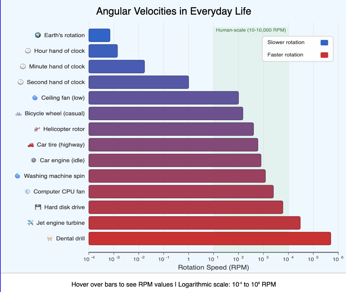 An interactive horizontal bar chart comparing angular velocities of common rotating objects on a logarithmic scale. -