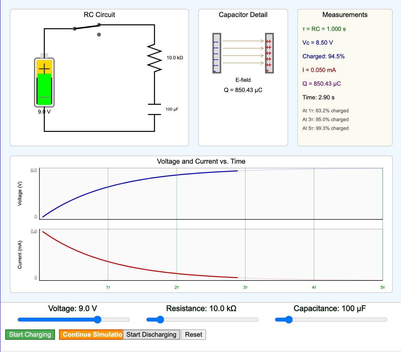 Interactive simulation showing how capacitors store and release energy in RC circuits with exponential charging/discharging behavior. -