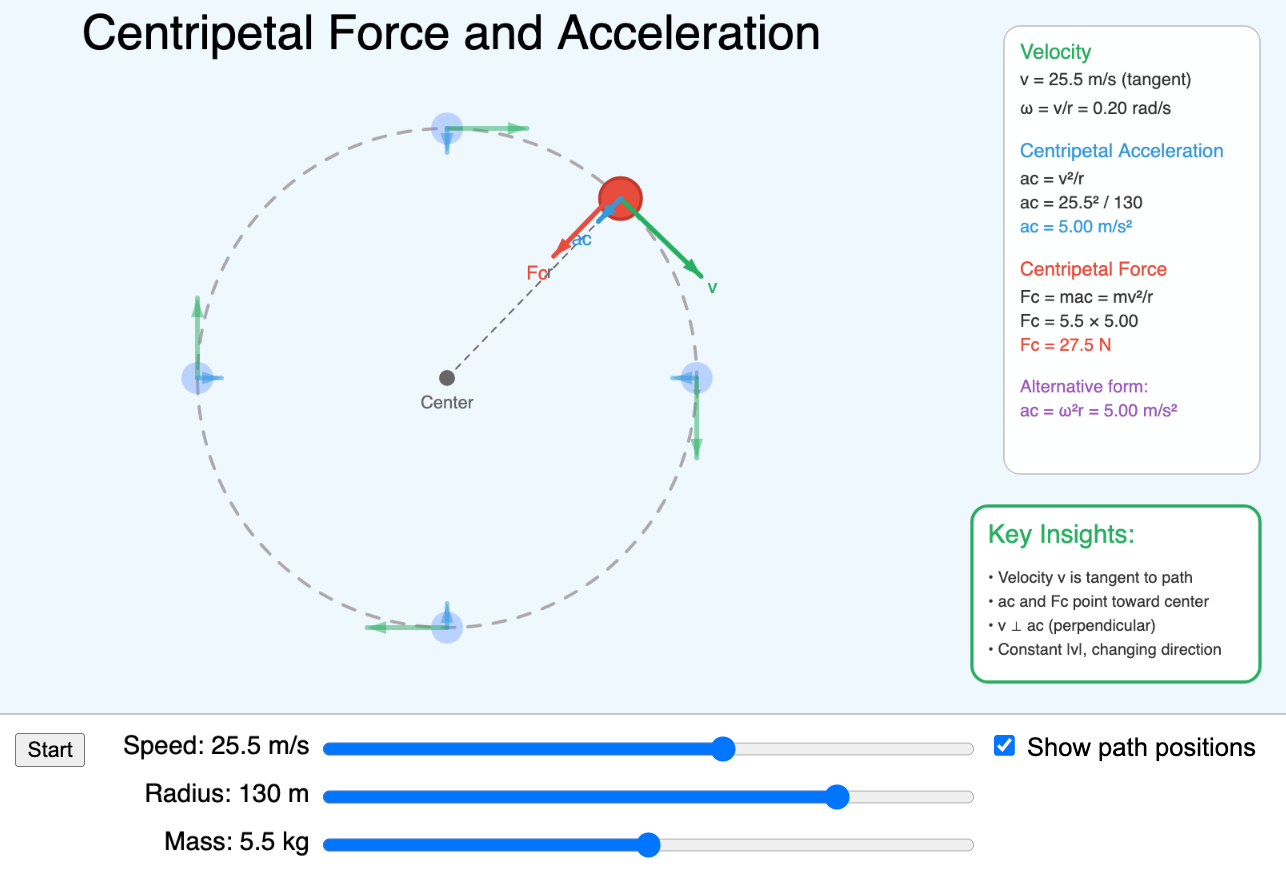 Interactive visualization showing the relationship between velocity, centripetal acceleration, and centripetal force in circular motion. -