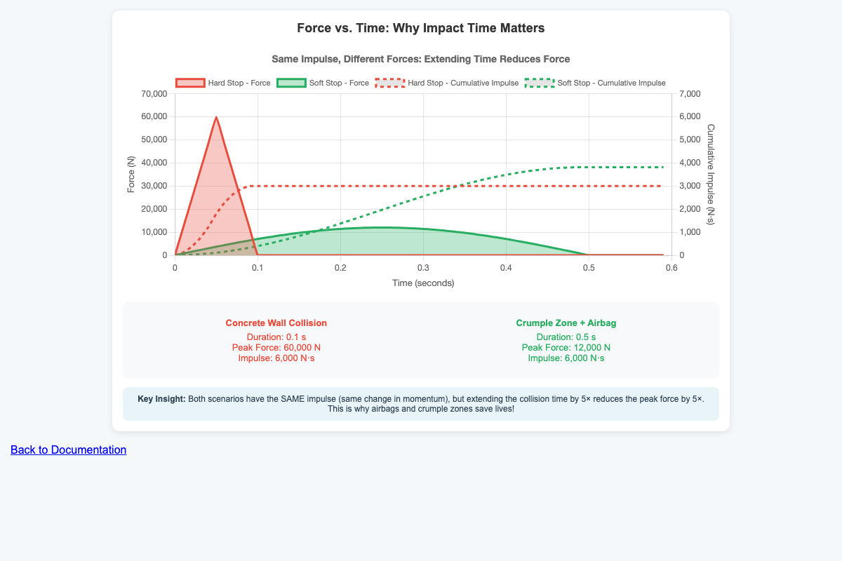 Chart comparing how extending impact time reduces peak force while maintaining the same impulse. -