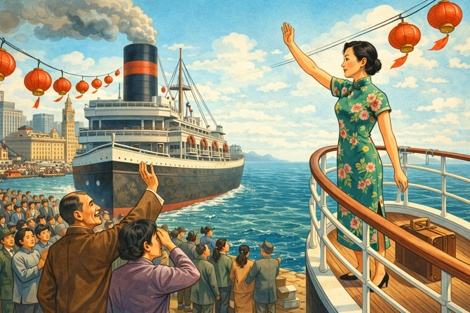 Image 2: Please generate a new wide-landscape illustration. A colorful, bright wide-landscape illustration in a 1930s ocean liner style showing Chien-Shiung Wu's departure from Shanghai in 1936. A massive steam ship prepares to leave the harbor. On deck, young Wu—elegant in a qipao dress, a small suitcase at her feet—waves to her parents on the crowded dock below. Her mother wipes tears; her father waves encouragingly. The Shanghai skyline, a mix of traditional Chinese and art deco buildings, rises behind the dock. Red paper lanterns flutter in the wind. The vast Pacific Ocean stretches toward an unseen America. Wu's expression shows determination mixed with the sorrow of leaving home. The scene captures the courage of crossing oceans for knowledge.Chapter 2 – Berkeley and the Bomb