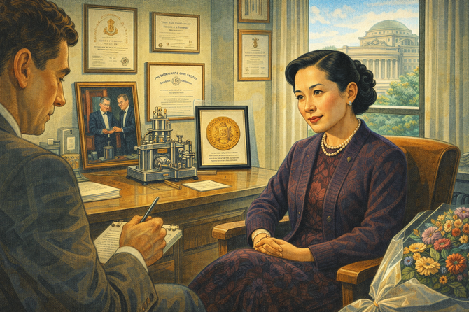 Image 9: Please generate a new wide-landscape illustration. A colorful, bright wide-landscape illustration in a late 1950s portrait style showing Chien-Shiung Wu in a formal interview setting around 1958. She sits elegantly in her Columbia office, surrounded by awards and certificates—the National Medal of Science prominent among them, but no Nobel medal. A journalist takes notes while she speaks with composure. Her desk holds her famous experimental apparatus in miniature, plus a photo of Lee and Yang at their Nobel ceremony. Through the window, the Columbia campus is visible. Wu's expression is serene and proud. The scene conveys dignity in the face of injustice—a woman who refused to let unfairness diminish her achievements.Chapter 9 – Why Does It Matter?