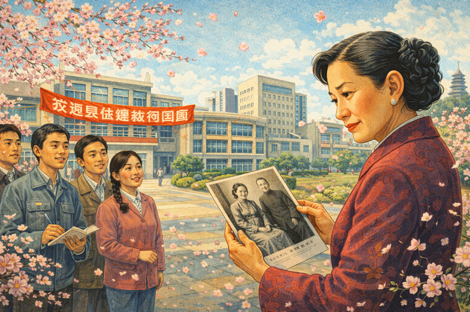 Image 11: Please generate a new wide-landscape illustration. A colorful, bright wide-landscape illustration blending 1970s Chinese and American elements showing Chien-Shiung Wu's return to China in 1973. Wu, now in her 60s with gray-streaked hair, stands before the transformed site of her father's school. Modern buildings have replaced the traditional architecture. She holds an old photograph of her parents, comparing it to the changed landscape. Young Chinese physics students surround her admiringly, but her expression is bittersweet—homecoming mixed with loss. A banner welcomes her as a national hero. Cherry blossoms fall, connecting past and present. The scene conveys the complicated emotions of returning to a homeland that has become foreign.Chapter 11 – The Quiet Revolution