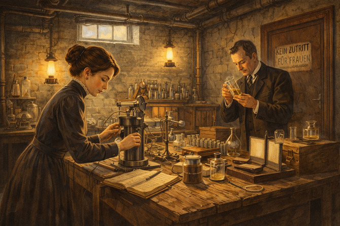 Image 3: Please generate a new wide-landscape illustration. A colorful, bright wide-landscape illustration in an early 1900s Berlin industrial-scientific style showing Lise Meitner's basement laboratory around 1908. The cramped space has exposed pipes overhead and rough wooden workbenches. Lise, wearing a practical dark dress and her hair pinned up, adjusts radioactivity detection equipment while Otto Hahn examines chemical samples nearby. Despite the humble setting, sophisticated instruments—electroscopes, photographic plates, and sample containers—crowd the surfaces. A single high window provides dim light; gas lamps supplement it. A door marked "KEIN ZUTRITT FÜR FRAUEN" (No Entry for Women) is visible in the background. The scene conveys brilliant science conducted despite institutional contempt.Chapter 3 – Thirty Years of Discovery