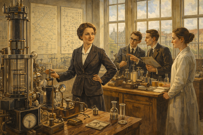 Image 4: Please generate a new wide-landscape illustration. A colorful, bright wide-landscape illustration in a 1920s German academic style showing Lise Meitner at the height of her career around 1930. She stands confidently in a well-equipped laboratory at the Kaiser Wilhelm Institute, surrounded by advanced physics equipment and younger researchers who look to her for guidance. Now in her fifties, she wears a professional dark suit. On the walls hang charts of radioactive decay chains and atomic diagrams. Through large windows, the handsome buildings of the Institute are visible. Colleagues consult with her as equals. The scene conveys hard-won respect, scientific authority, and a brief golden age before catastrophe.Chapter 4 – The Shadow Falls