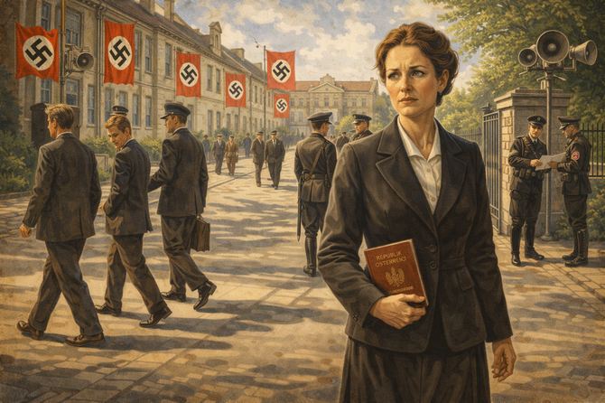 Image 6: Please generate a new wide-landscape illustration. A colorful, bright wide-landscape illustration in a 1938 historical documentary style showing the immediate aftermath of the Anschluss in Berlin. Lise Meitner walks alone through the Institute grounds, now decorated with Nazi swastika banners. She clutches her now-invalid Austrian passport. Other scientists—former colleagues—look away or cross the street to avoid her. In the background, radio loudspeakers broadcast Hitler's triumphant speech. Armed SS officers check papers at the gate. Lise's face shows controlled fear; she walks with dignity but her eyes scan for danger. The bright spring sunshine creates a cruel contrast with the terror of the moment. The scene conveys sudden, absolute danger.Chapter 6 – Flight to Freedom
