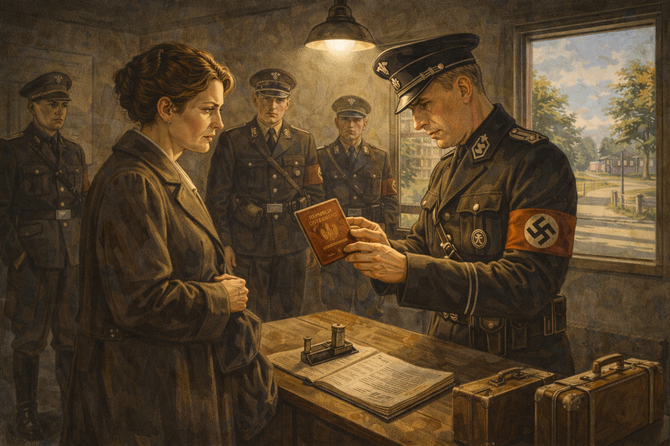 Image 7: Please generate a new wide-landscape illustration. A colorful, bright wide-landscape illustration in a 1938 dramatic escape style showing the German-Dutch border crossing. Lise Meitner, 59 years old, hands her invalid passport to a Nazi border guard in a stark checkpoint building. Dirk Coster stands nervously nearby, holding official-looking papers. Two small suitcases sit at Lise's feet—everything she owns. Her coat is slightly bulky where the diamond ring is hidden. The guard examines the passport under harsh electric light while other guards watch. Through the window, the Dutch side of the border is visible—freedom just meters away. Lise's face shows controlled terror. The scene captures the razor's edge between escape and capture.Chapter 7 – Exile in Sweden