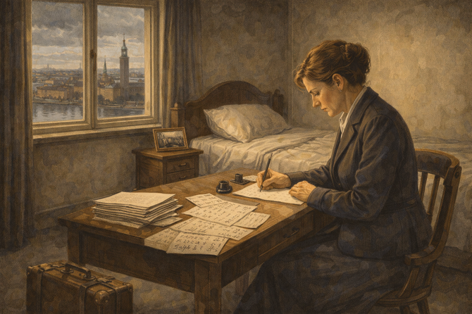 Image 8: Please generate a new wide-landscape illustration. A colorful, bright wide-landscape illustration in a late 1930s Swedish style showing Lise Meitner in her sparse Stockholm hotel room in autumn 1938. The small, clean but impersonal room contains only a bed, desk, and chair. Lise sits at the desk writing a letter, surrounded by scientific papers covered with calculations. Through the window, the unfamiliar spires of Stockholm are visible under gray northern skies. A photograph of the Berlin laboratory sits on the nightstand. On the desk, letters from Otto Hahn are stacked neatly. Her expression is melancholy but thoughtful—even in exile, she is working. The scene conveys isolation, loss, but also unbroken intellectual determination.Chapter 8 – The Mysterious Letter