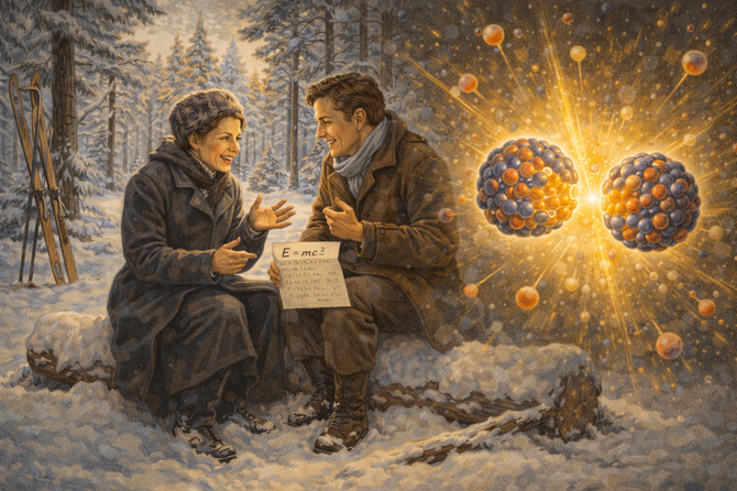 Image 10: Please generate a new wide-landscape illustration. A colorful, bright wide-landscape illustration in a Swedish winter landscape style showing the historic moment of discovery. Lise Meitner and Otto Frisch sit on a snow-covered fallen log in a peaceful Swedish pine forest, both bundled in winter coats. Lise's cross-country skis lean against a tree. Between them, a scrap of paper shows E = mc² and hasty calculations. Their faces are animated with the excitement of understanding—the "eureka" moment. Snow blankets the landscape; weak winter sunlight filters through the trees. In an artistic overlay, a glowing visualization shows a uranium nucleus wobbling and splitting into two smaller nuclei, releasing energy. The scene captures science's most consequential walk in history.Chapter 10 – A World Transformed