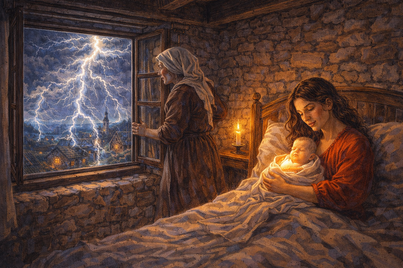 Image 1: Please generate a new 16:9 w:h ratio illustration. A colorful, bright illustration of a room of mid-19th century Eastern European village showing Tesla's dramatic birth in Smiljan in 1856. The scene is a bedroom in a small stone house with a large window. Outside, through the window, we see a violent thunderstorm—lightning fills the sky, illuminating the village. In the bedroom a baby has just been born and is being held by his mother. The midwife looks out the window, frightened at the storm, but the mother gazes at her newborn with fierce love. Outside, lightning strikes repeatedly, as if announcing something momentous. The scene should blend the humble village setting with supernatural electrical drama. Young Nikola seems to glow faintly even as an infant, connected somehow to the storm outside.Chapter 1 – A Mind Like No Other