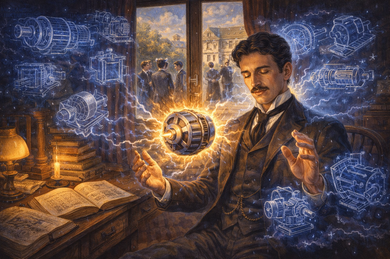 But Tesla learned to harness these visions. He could imagine a machine, examine it from every angle in his mind, run it mentally, find the flaws, and fix them—all without drawing a single line on paper.